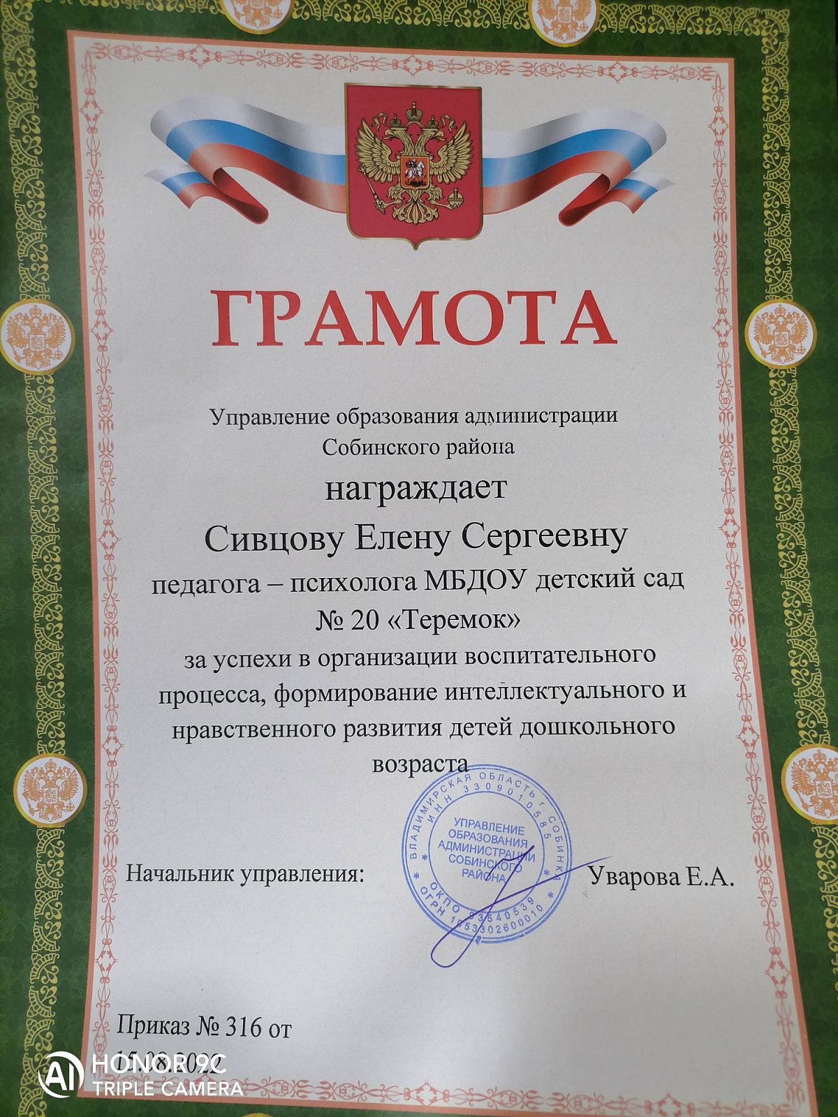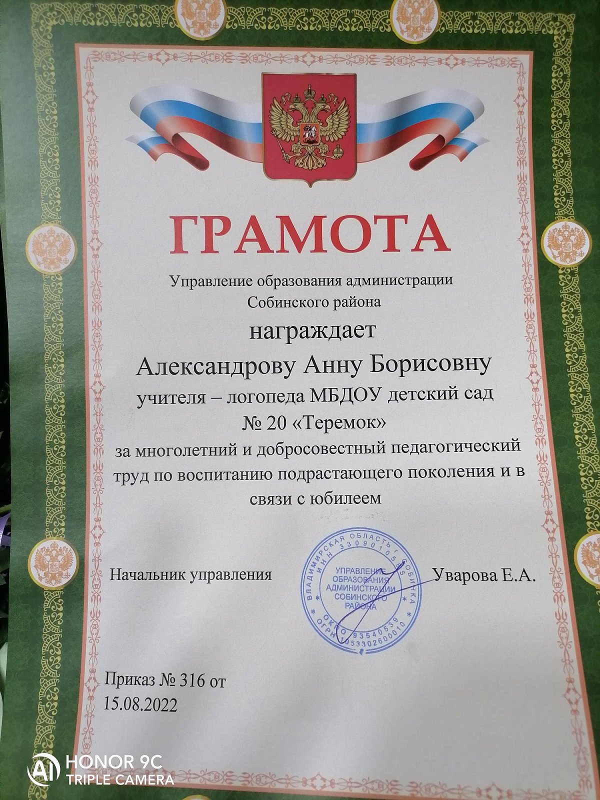 Поздравляем: педагога - психолога Сивцову Елену Сергеевну , воспитателя Пинчук Олесю Александровну, учителя – логопеда Александрову Анну Борисовну с награждением грамотой Управления образования администрации Собинского района.