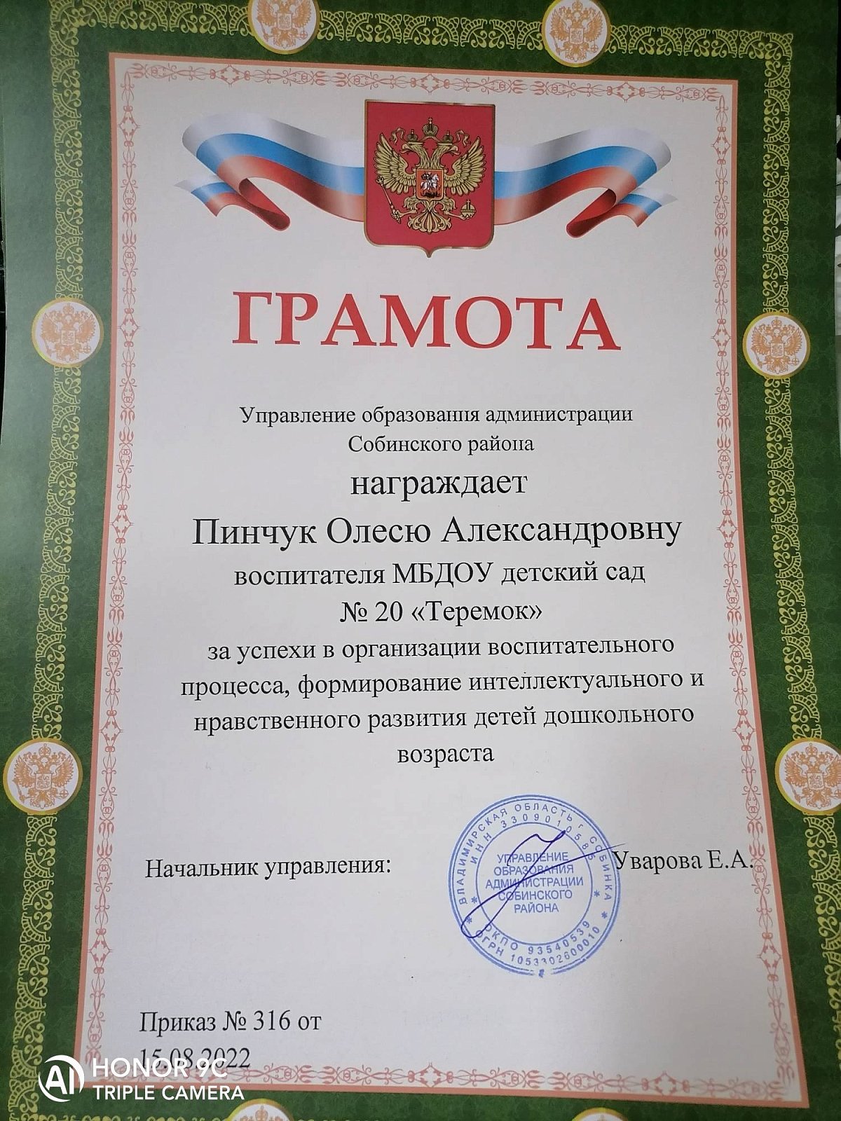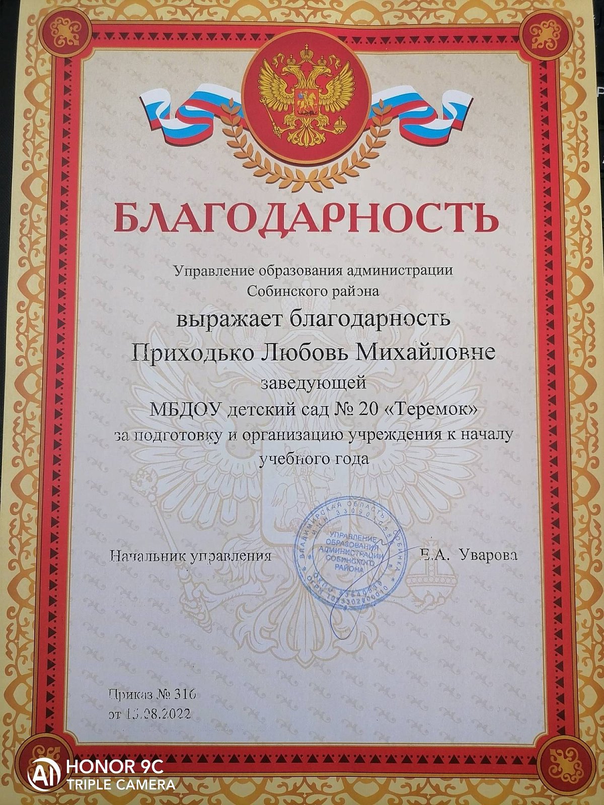 Просто замечательно, что рядомНашей заведующей Приходько Любови Михайловне Управлением образования администрации Собинского района выражена Благодарность за подготовку и организацию учреждения к началу учебного года.