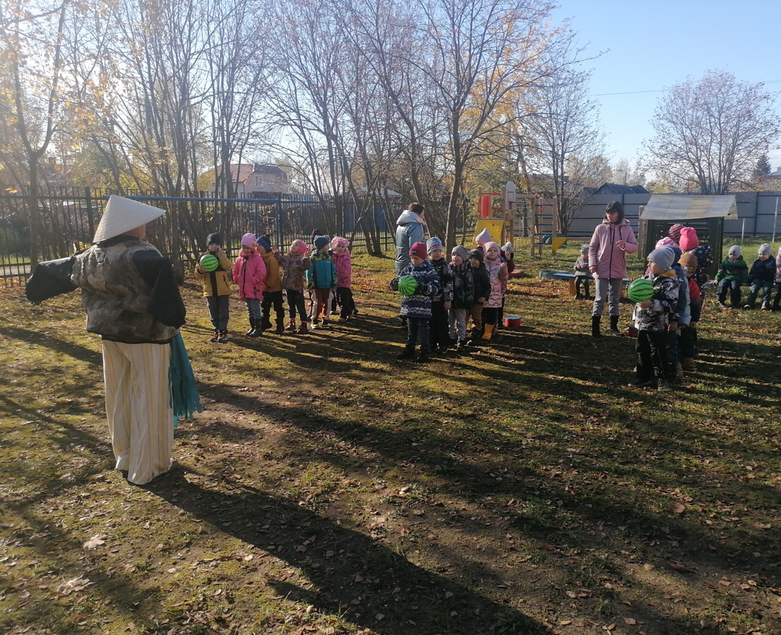 Пугало – огородное загадало детям загадки, поиграло в спортивные игры, «помогло собрать» урожай овощей и фруктов.