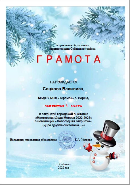 В номинации "Новогодняя открытка" награждается Соцкова Василиса, занявшая 3 место.
