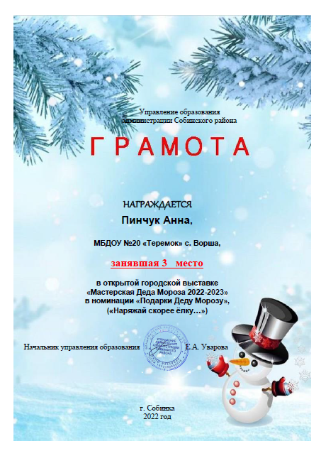 В номинации "Подарки Деду Морозу" награждается Пинчук Анна, занявшая 3 место.