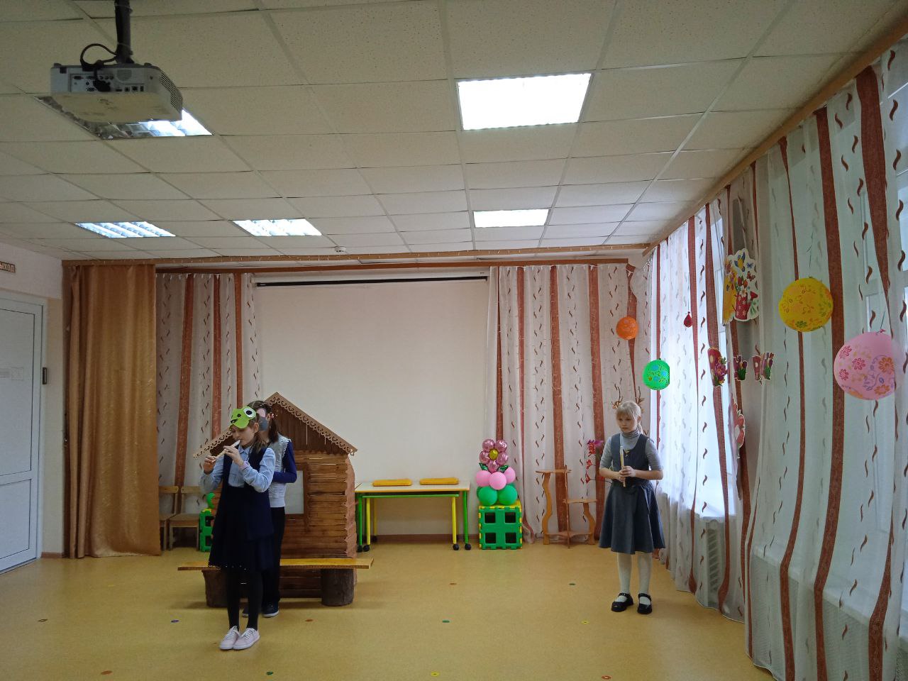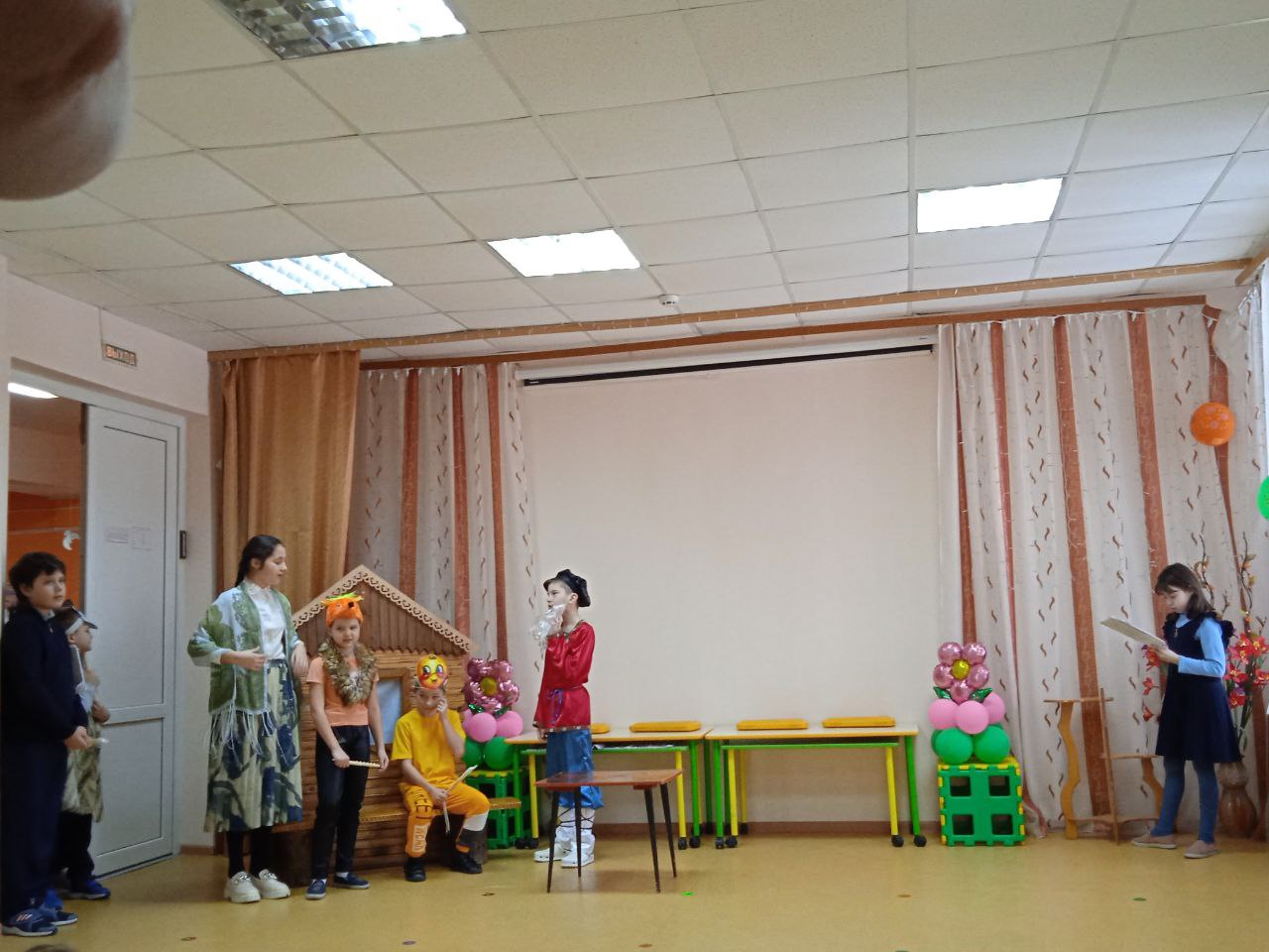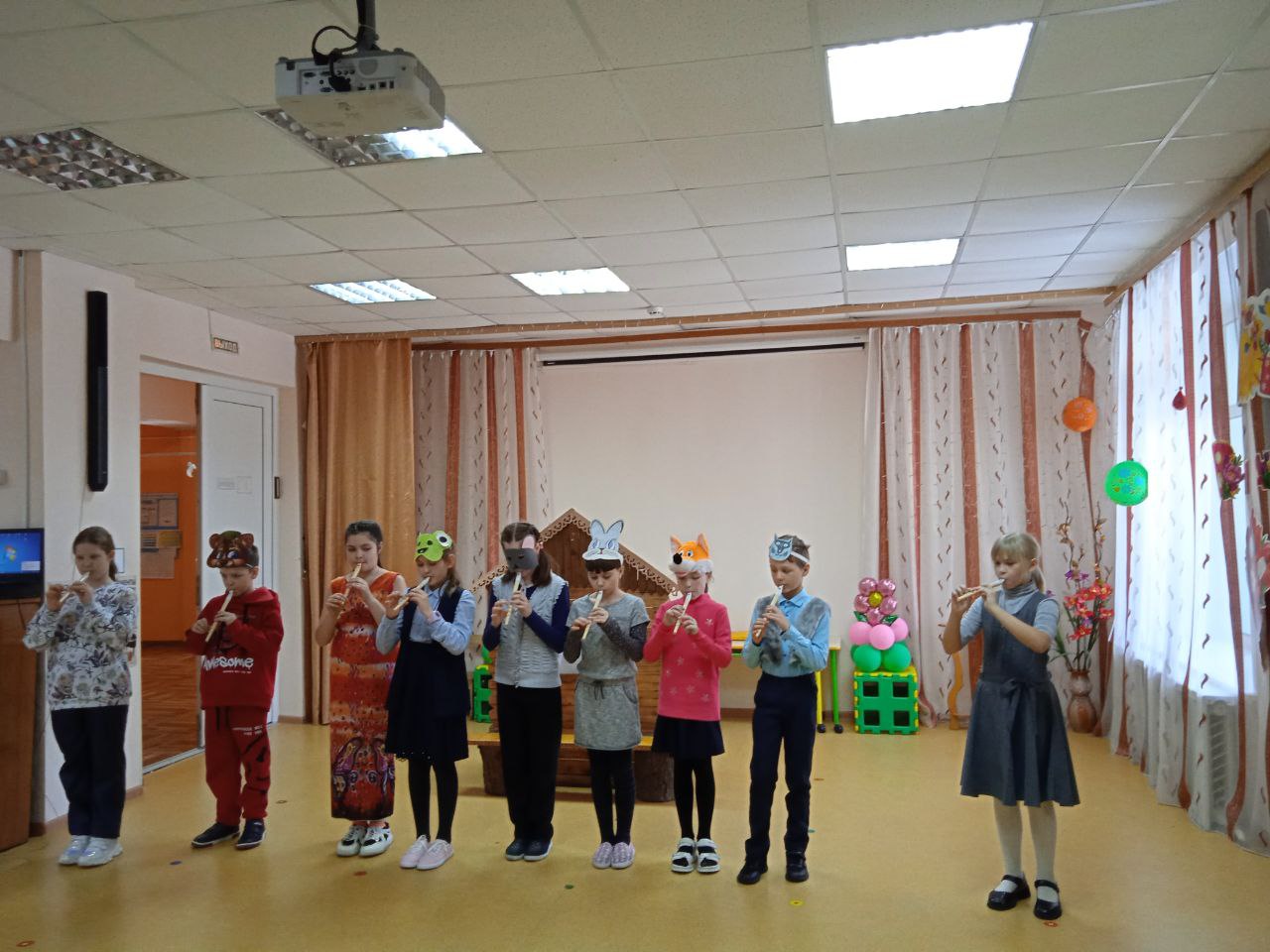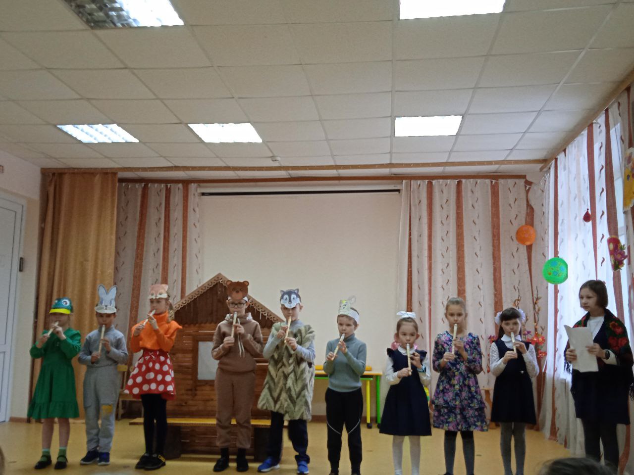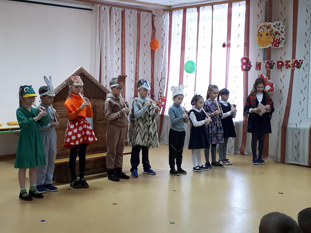 На одном дыхании смотрели и слушали дети выступления школьников. Ученики 4-ого класса представили вниманию хорошо известную сказку «Колобок», в которой каждый герой играл на свирели. Это было интересно и необычно смотреть и слушать. Ребята 1-ого и 3-ого класса показали свои версии сказки «Теремок». А ученики 2-ого класса выступили с весёлым оркестром, в котором звучали и свирель, и деревянные ложки, и трещётки, и колокольчики и даже барабан.