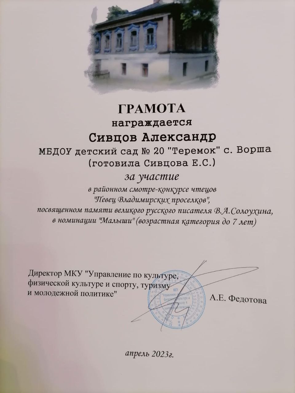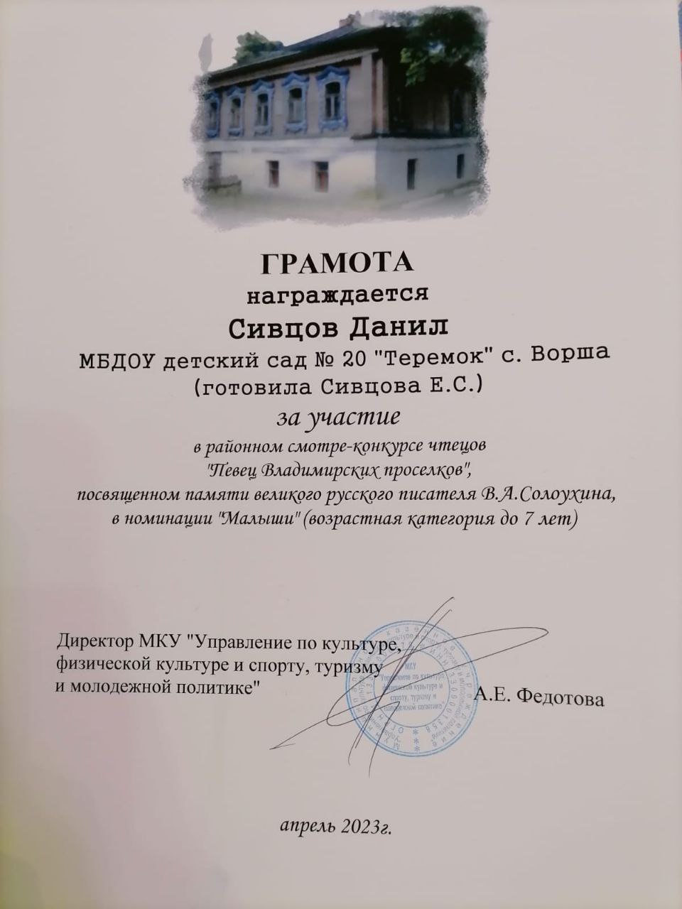 В этом году наше ДОУ на конкурсе представляли братья Сивцовы Александр и Данил. Мальчики достойно выступили в своей номинации и были отмечены грамотами и ценными подарками.