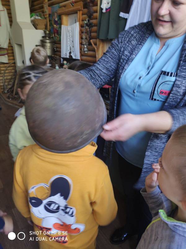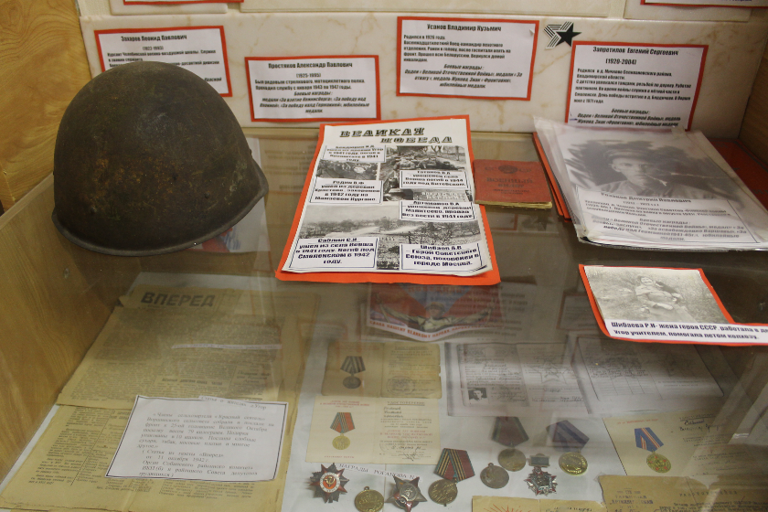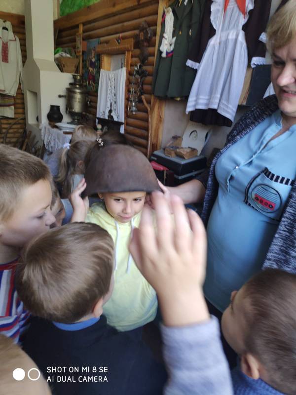 У стендов школьного музея,Сегодня наши воспитанники посетили музей при Воршинской СОШ. Ребята узнали много интересного о событиях Великой Отечественной Войны, о подвиге русского солдата, о мужестве наших прадедов. Дети с большим интересом слушали учителя истории Воропаеву О.Н., задавали вопросы, «примерили» солдатскую каску, рассматривали экспонаты. Среди них личные вещи участников войны. Также гостям были представлены стенды с фотографиями, документами, биографиями, письмами, книгами.