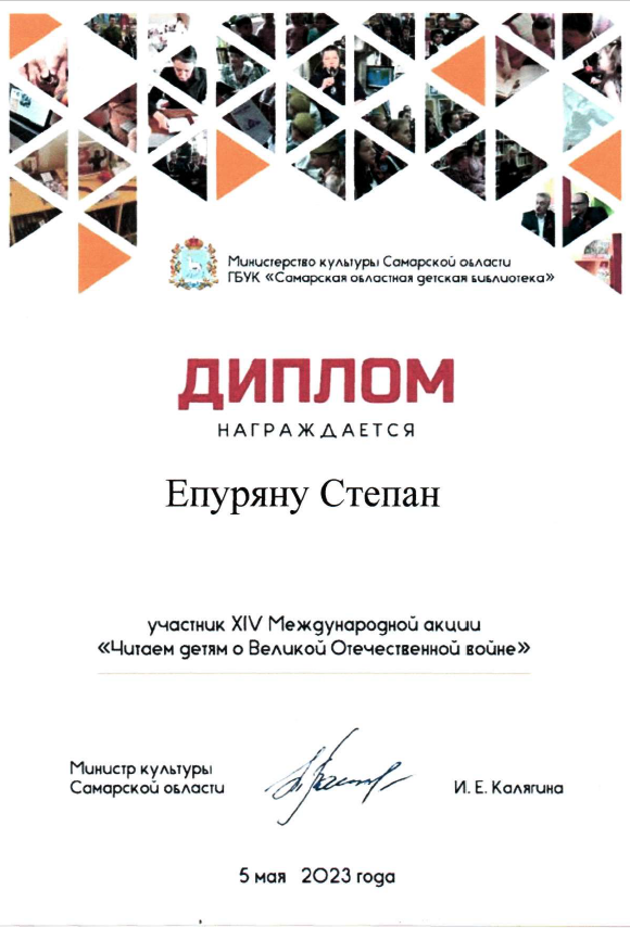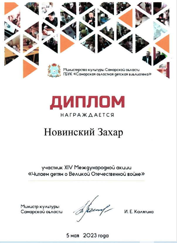 5 мая 2023 года ГБУК «Самарская областная детская библиотека» проводила XIV Международную Акцию «Читаем детям о Великой Отечественной войне». В основе Акции – живое чтение вслух произведений о наиболее ярких эпизодах войны детям в возрасте от 5 до 15 лет в детских учреждениях, не зависимо от ведомственной подчиненности.