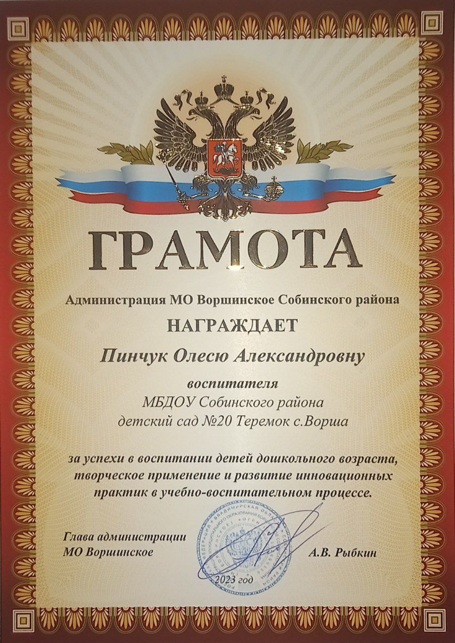 В " Год педагога и наставника" за успехи в воспитании детей дошкольного возраста, творческое применение и развитие инновационных практик в учебно-воспитательном процессе грамотой главы Администрации МО Воршанское А.В.Рыбкиным награждена наш замечательный и творческий педагог Олеся Александровна Пинчук.
