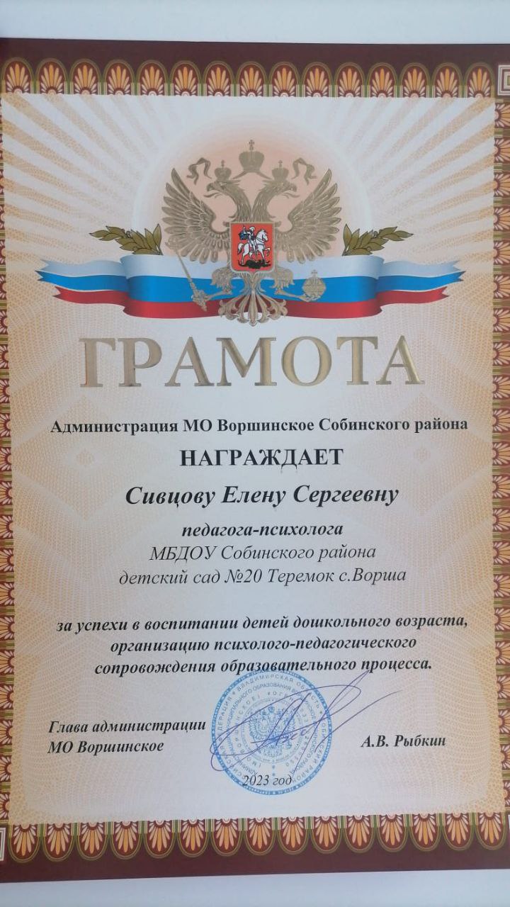 В " Год педагога и наставника" за успехи в воспитании детей дошкольного возраста, организацию психолого - педагогического сопровождения образовательного процесса грамотой главы Администрации МО Воршанское А.В.Рыбкиным награждена наш креативный и молодой педагог- психолог Елена Сергеевна Сивцова.