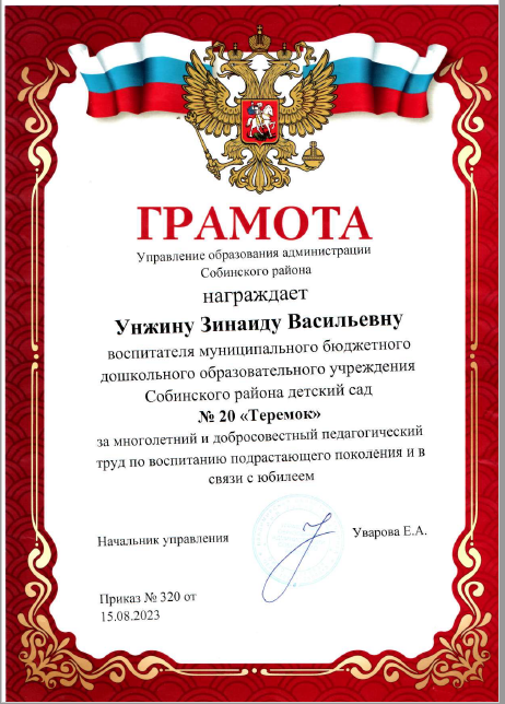 Поздравляем Вас с заслуженной наградой,За многолетний добросовестный педагогический труд по воспитанию подрастающего поколения и в связи с Юбилеем наш педагог Зинаида Васильевна Унжина награждена Грамотой Управления образования Собинского района.