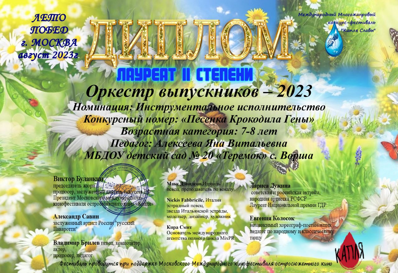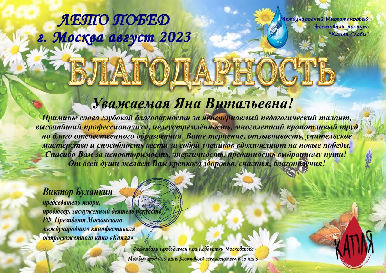 Наши воспитанники под руководством музыкального руководителя Я.В.Алексеевой приняли участие в Международном многожанровом фестивале - конкурсе «Капля Славы. Лето Побед» при поддержке Московского Международного кинофестиваля остросюжетного кино «Капля».