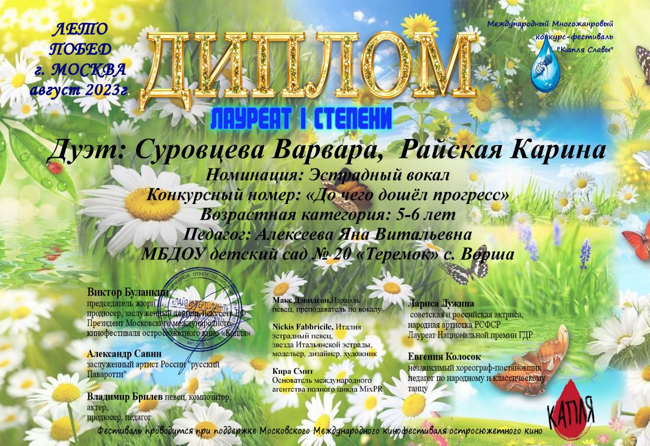 В номинации «Эстрадный вокал» в возрастной категории 5-6 лет дуэт Суровцева Варвара и Райская Кристина стал лауреатом I степени.