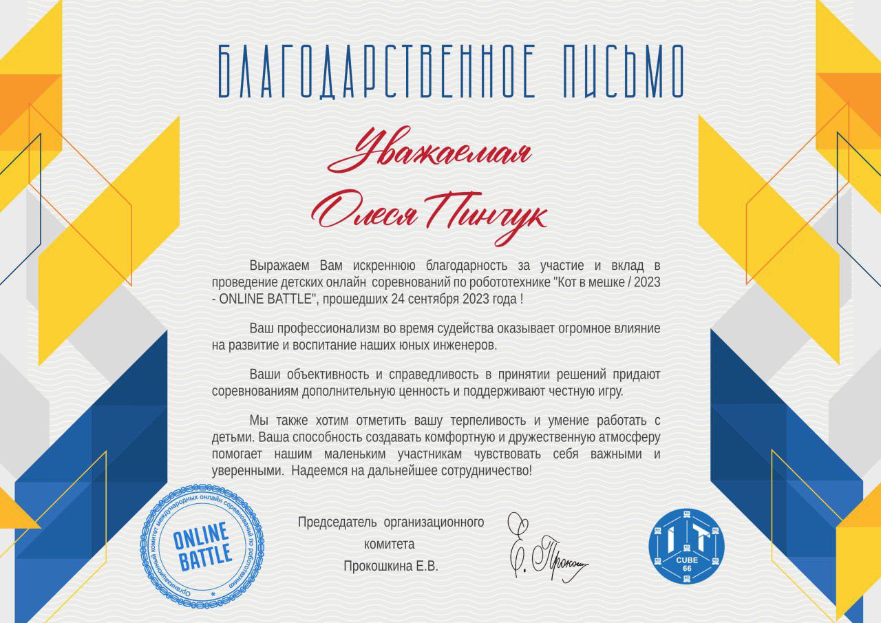 Благодарностью за участие и вклад в проведение детских онлайн соревнований по робототехнике, за объективность и справедливость в принятии решений Благодарственным письмом отмечен наш педагог О.А.Пинчук.