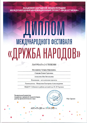 Наши педагоги под руководством старшего воспитателя Е.А. Мишутиной участвовали в Международном фестивале «ДРУЖБА НАРОДОВ», который проводился Академией народной энциклопедии (АНЭ) совместно с Детской академией развития «ДАР» в рамках реализации Международного инновационного проекта «Моя Отчизна». В номинации методические разработки был представлен проект «Село мое родное – частичка Родины моей». По оценке жюри мы награждены Дипломом II степени.