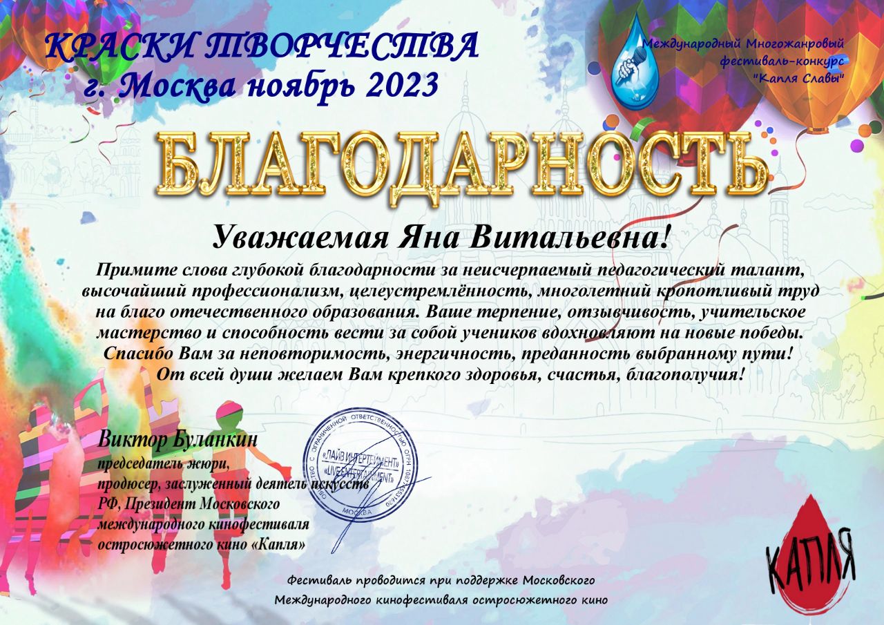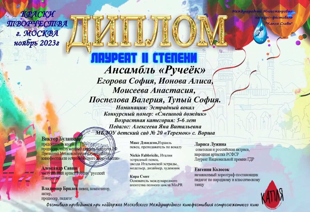Воспитанники нашего ДОО под руководством музыкального руководителя Я.В.Алексеевой стали ЛАУРЕАТАМИ II СТЕПЕНИ в Международном многожанровом фестивале – конкурсе " КАПЛЯ СЛАВЫ. КРАСКИ ТВОРЧЕСТВА !" при поддержке Московского Международного кинофестиваля остросюжетного кино "КАПЛЯ".От всей души поздравляем наших победителей и желаем творческих побед.
