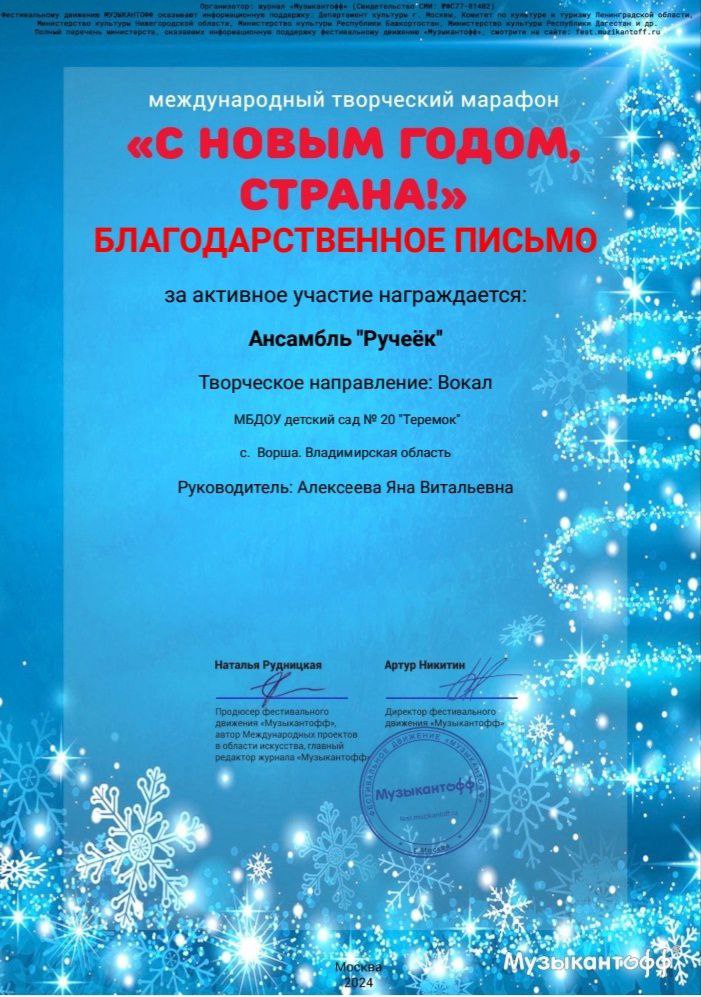 Ребятишки- оркестранты!В честь праздника Нового года-2024 командой МУЗЫКАНТОФФ был объявлен Международный творческий марафон «С Новым годом, СТРАНА!» Наши ансамбли «Свирелюшка» и «Ручеёк» под руководством музыкального руководителя Я.В. Алексеевой приняли активное участие, представив музыкальные номера с тематикой праздника. Ребята получили от организаторов МАРАФОНА Благодарственные письма за участие в данном проекте.