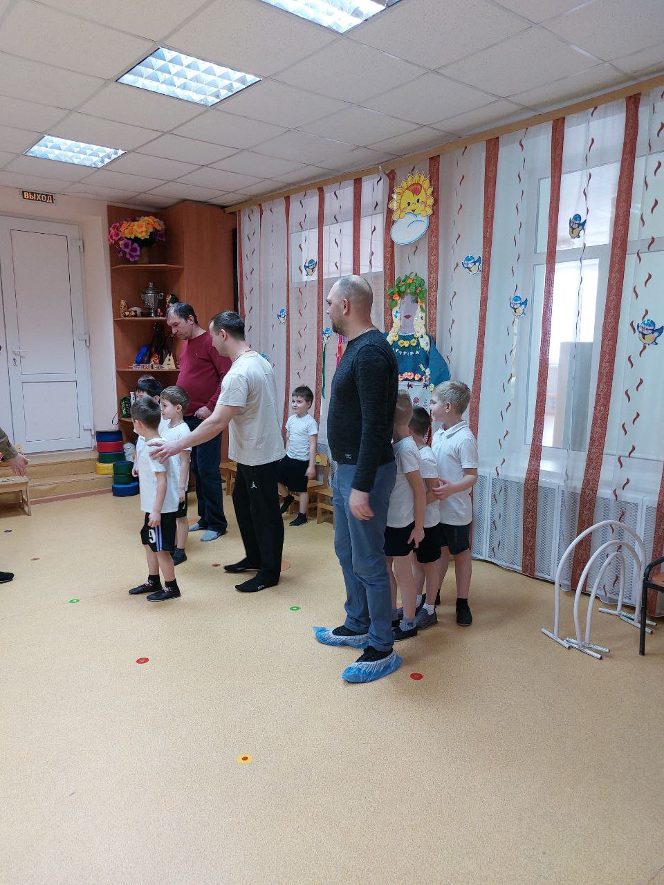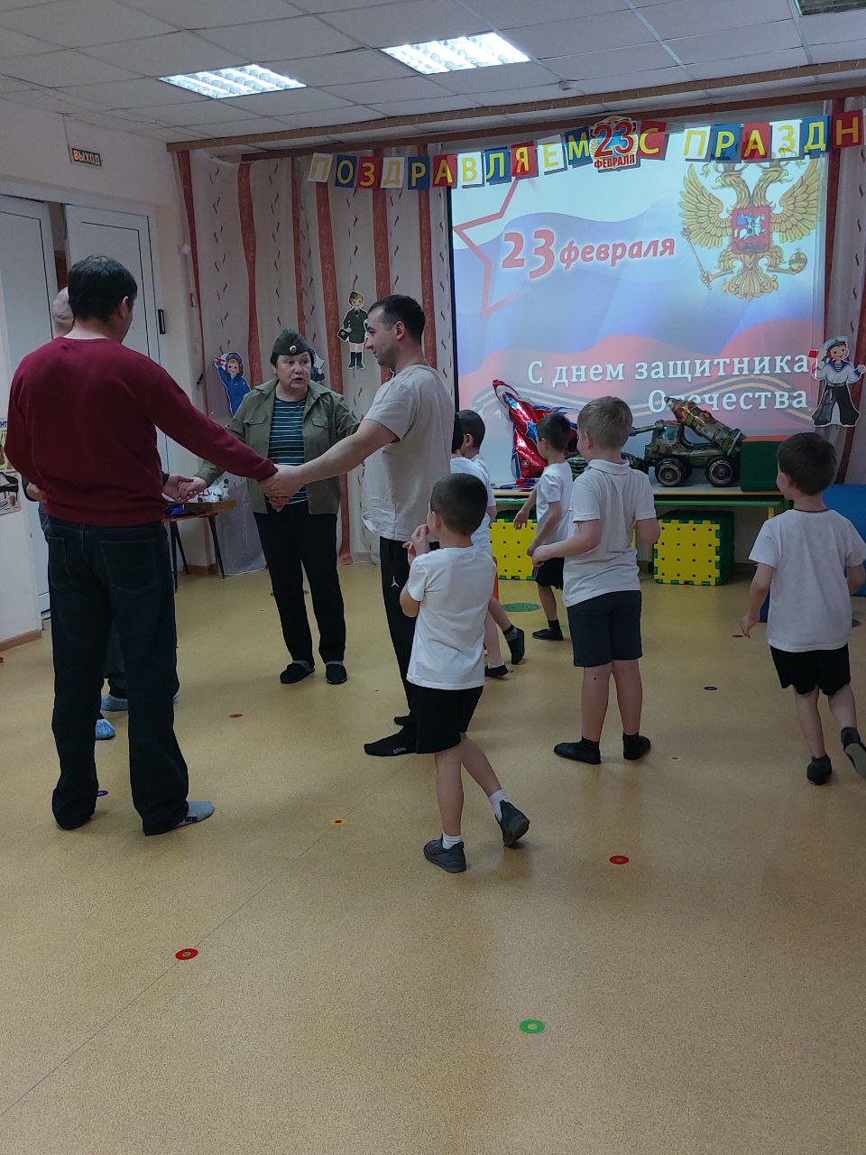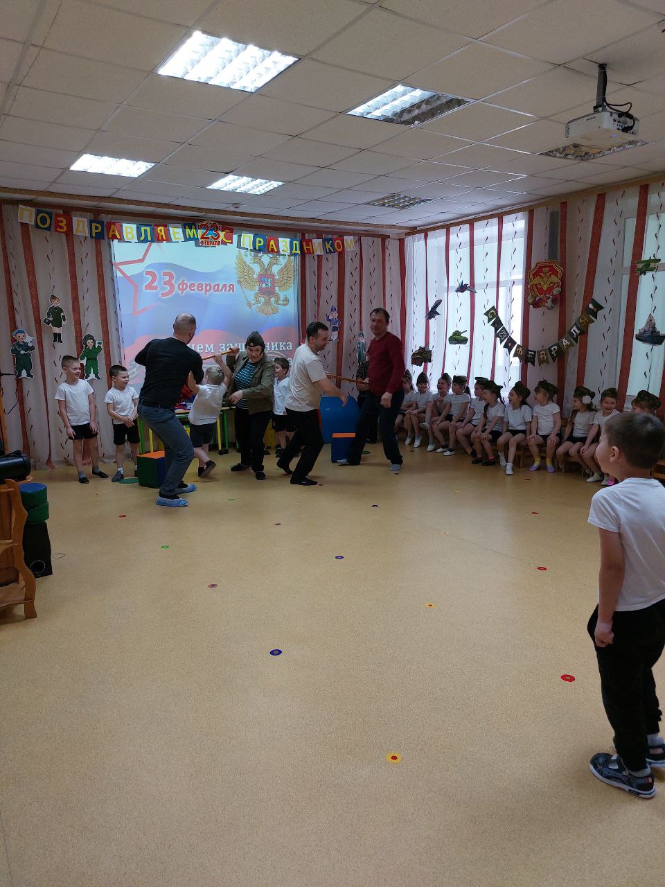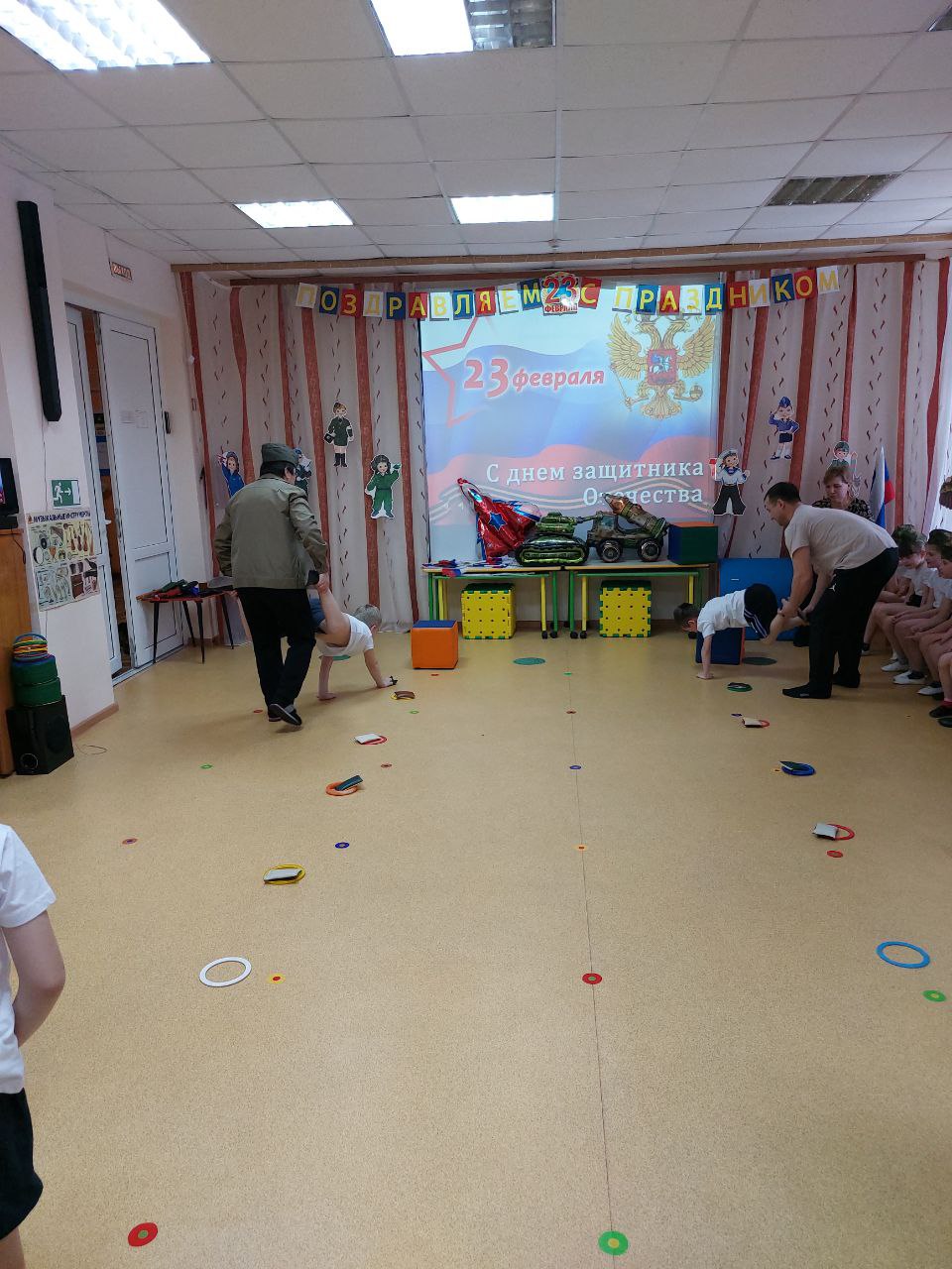 На празднике прошли конкурсы с участием присутствующих пап. Всем участникам предстояло проявить быстроту, ловкость, смекалку, мужество и чувство юмора.