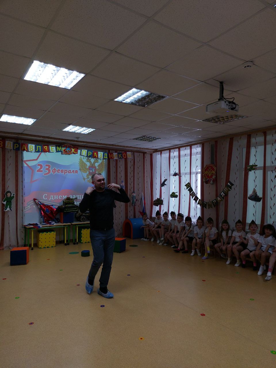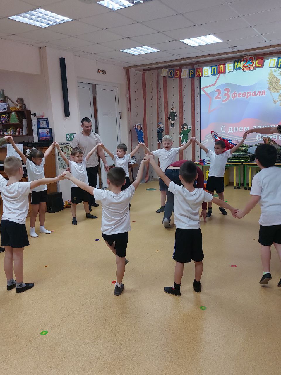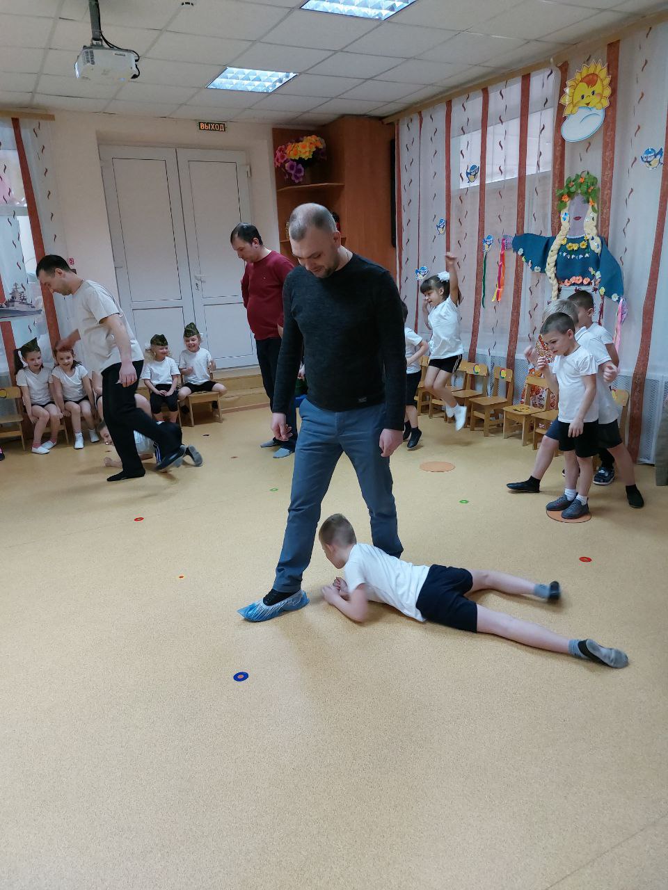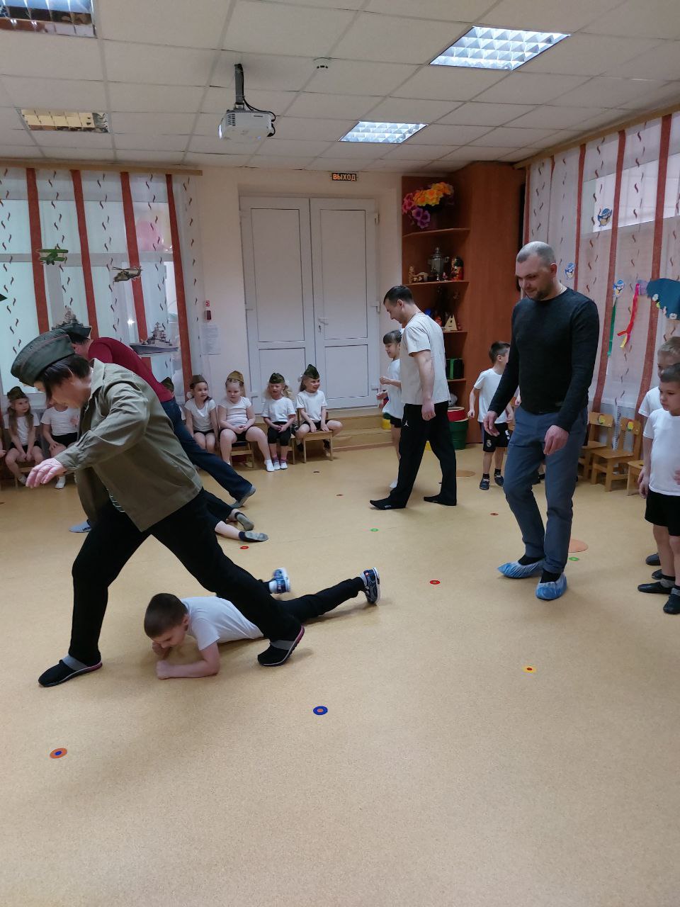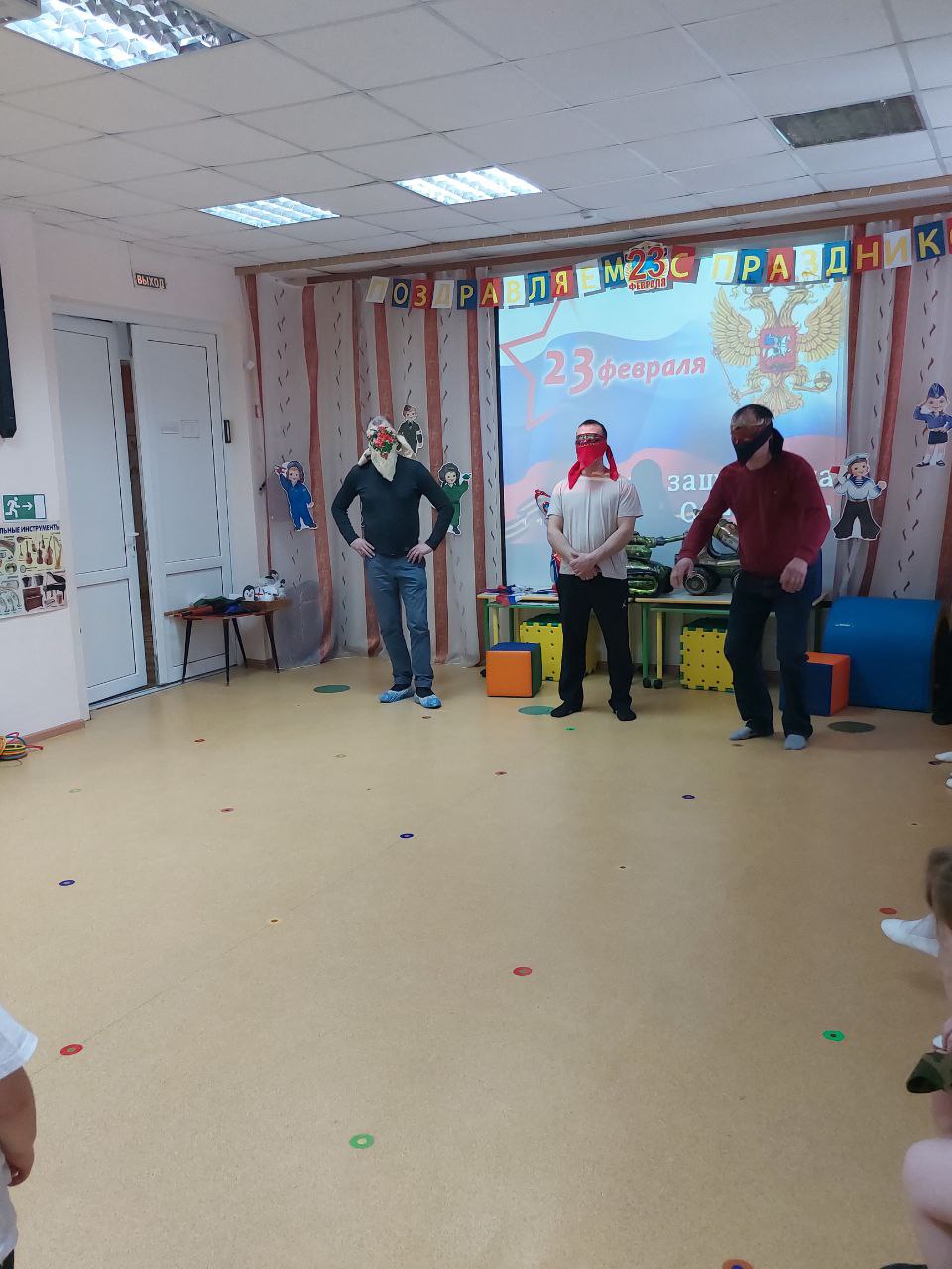 На празднике прошли конкурсы с участием присутствующих пап. Всем участникам предстояло проявить быстроту, ловкость, смекалку, мужество и чувство юмора.