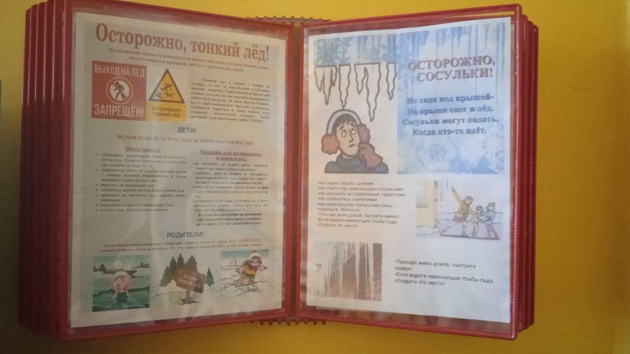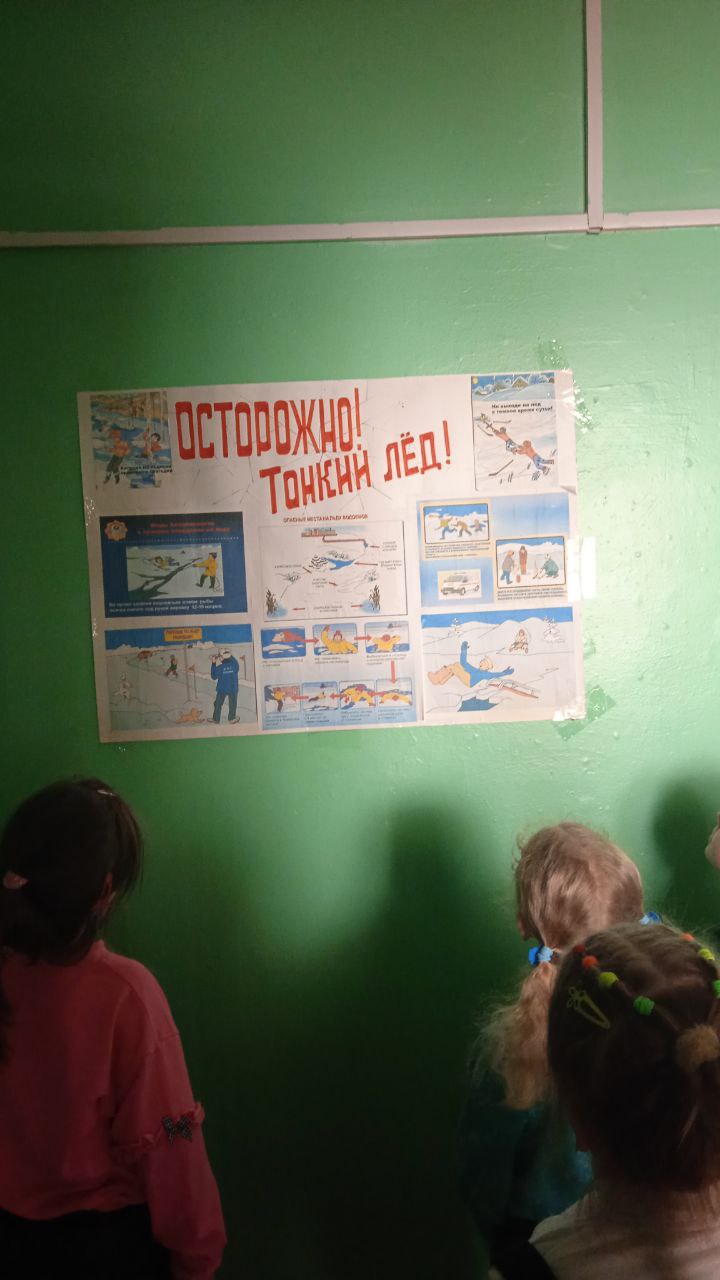 С целью предупреждения несчастных случаев и безопасного поведения детей на водных объектах в зимний период сегодня в нашем ДОО проведены мероприятия: рассматривания плакатов по данной теме с целью развития умения по картинкам определять опасную ситуацию; описывать ее, закрепления правил, которые надо соблюдать. В раздевалках групп обновлена информация для родителей. Проведена с воспитанниками словесная игра «Да или нет» (Если опасно – топаем ногами, если – нет, хлопаем в ладоши.)