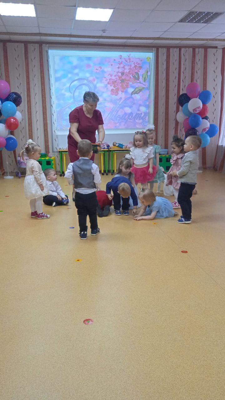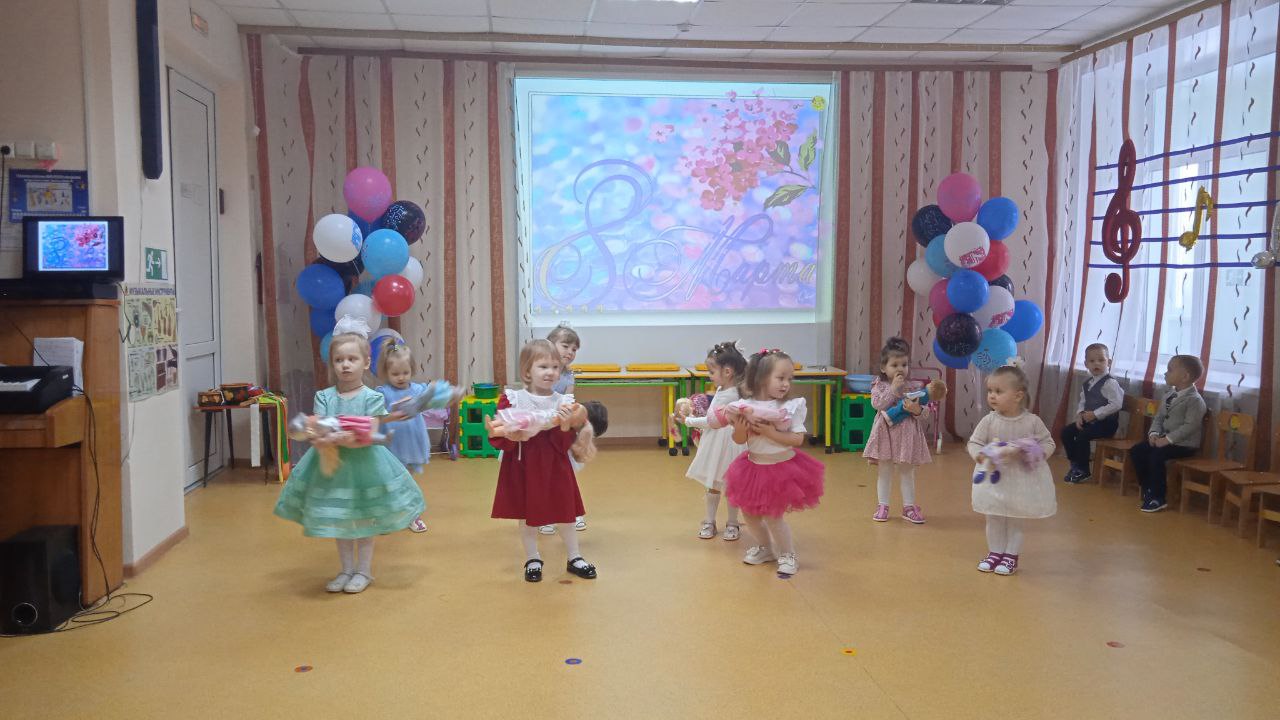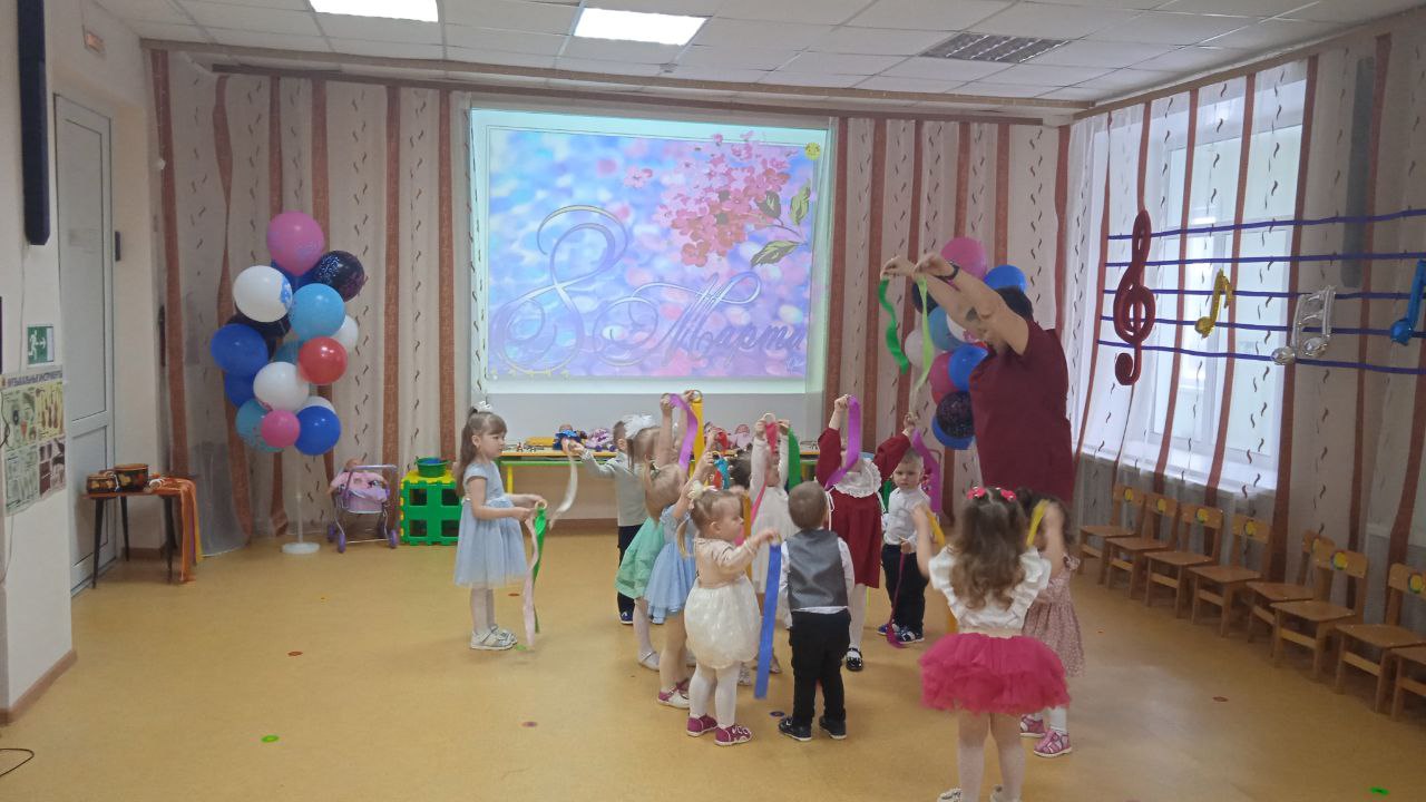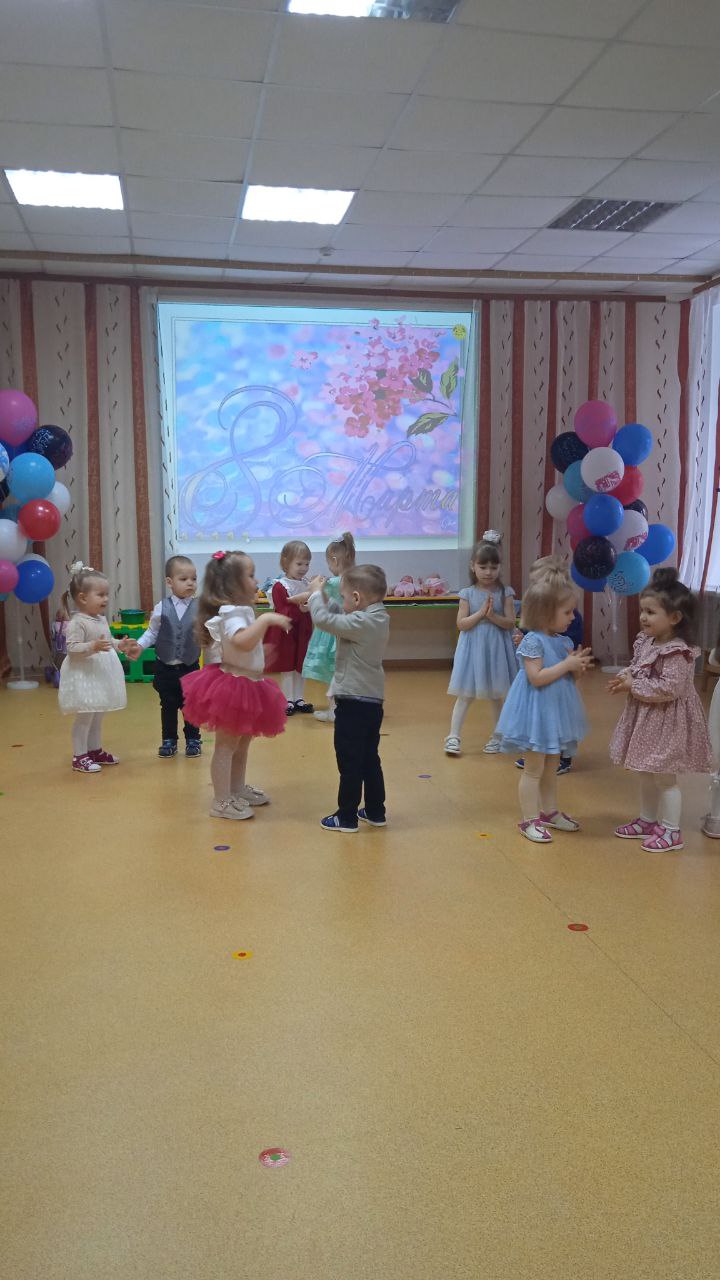 Посмотрите, наши малыши, на весенний праздник пришли! Сегодня в 1 младшей группе прошёл веселый праздник. Воспитанники танцевали, пели песенки про мам и бабушек, играли в игру «Собери бусы для мамы», сыграли веселую мелодию на бубнах.