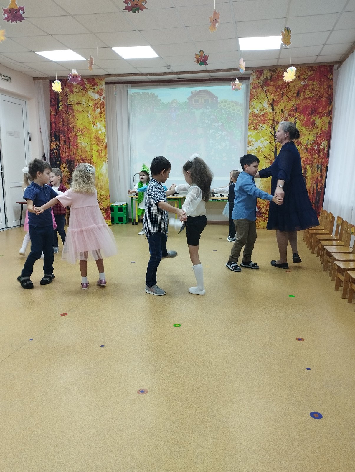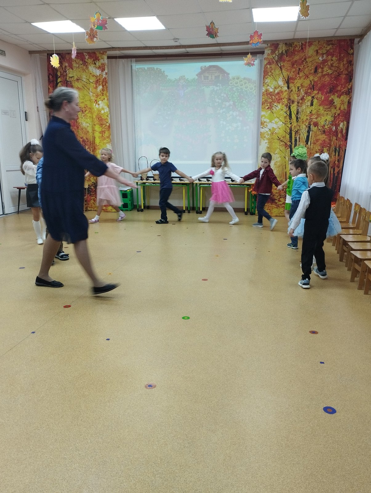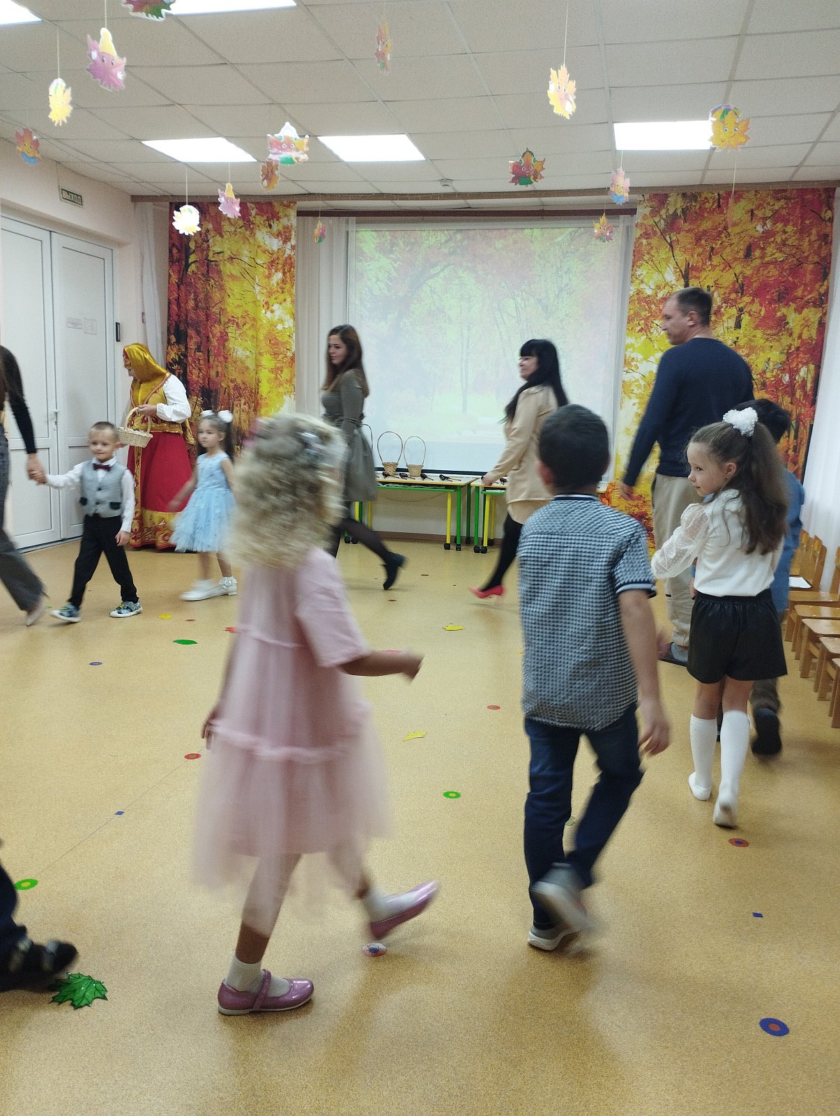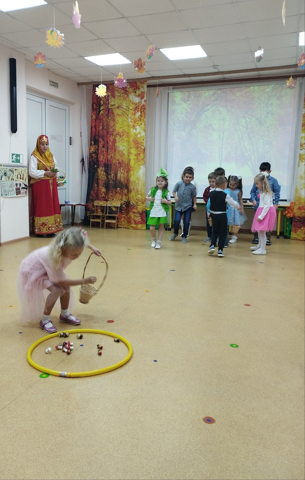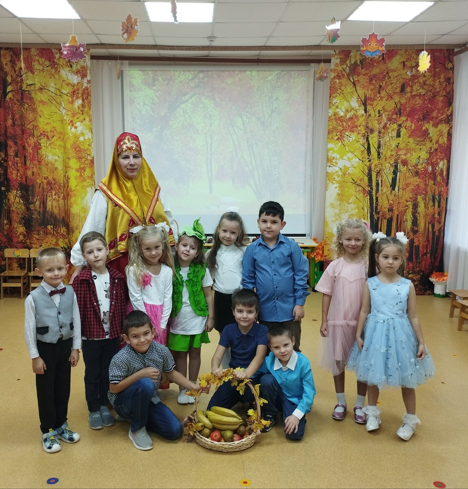 Красиво украшенный зал и веселая музыка создавали праздничное настроение. Воспитанники группы водили хоровод, пели песни, танцевали и принимали активное участие в подвижных играх. Праздник прошел весело и эмоционально. Все участники получили массу удовольствий и впечатлений. В завершение праздников дошколят ждал подарок от Осени — корзина с фруктами.