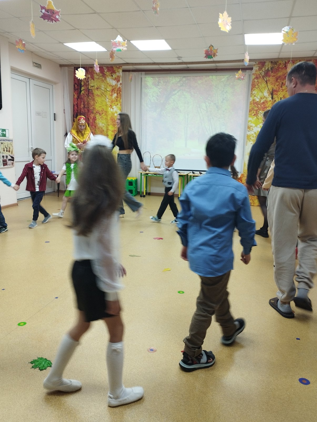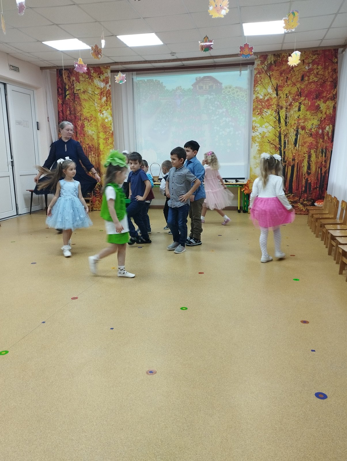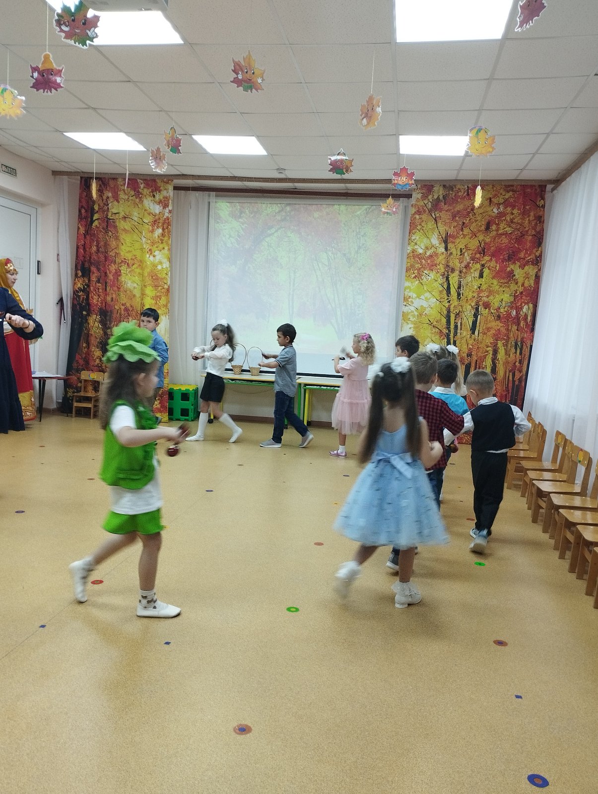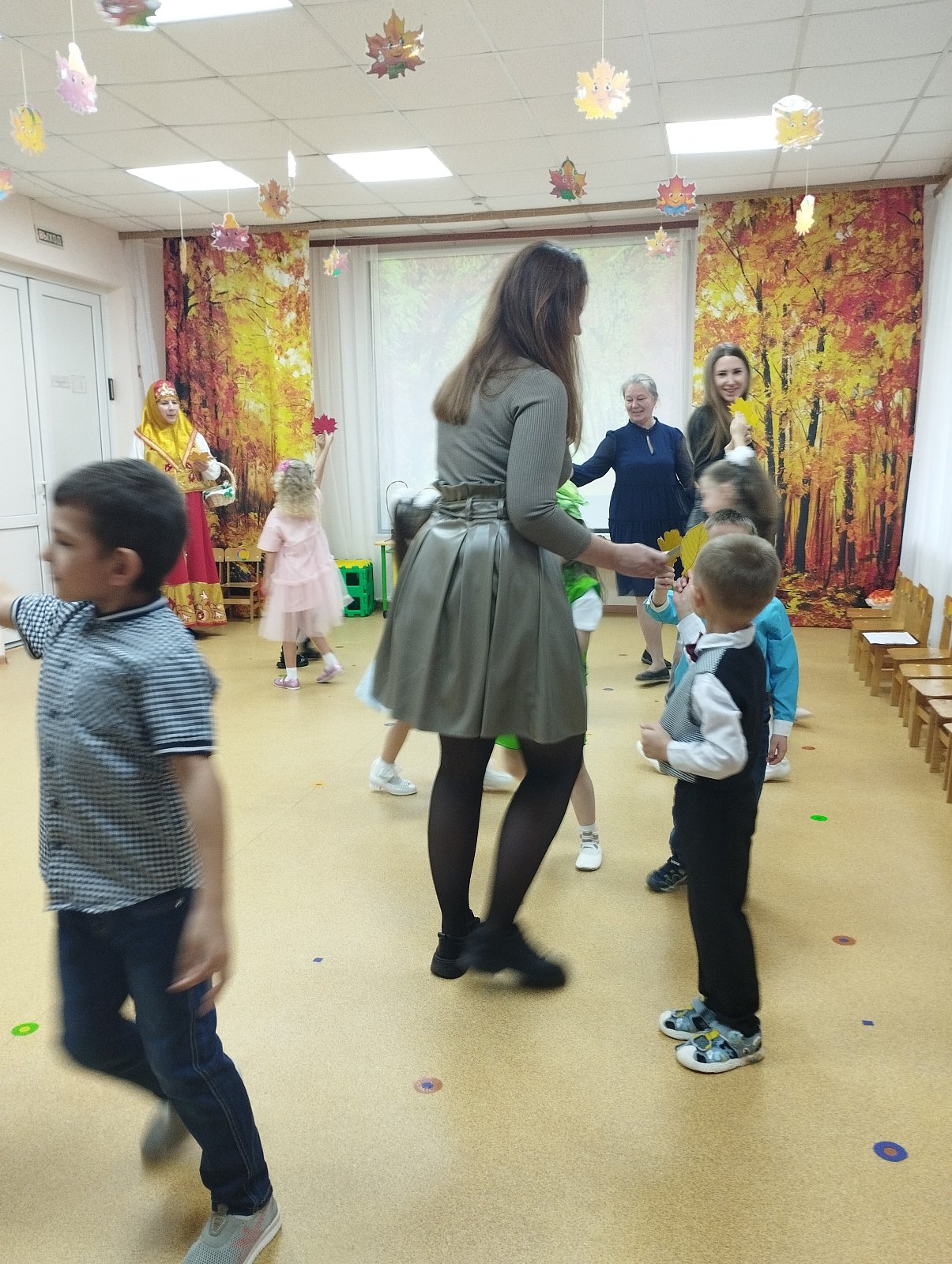 Красиво украшенный зал и веселая музыка создавали праздничное настроение. Воспитанники группы водили хоровод, пели песни, танцевали и принимали активное участие в подвижных играх. Праздник прошел весело и эмоционально. Все участники получили массу удовольствий и впечатлений. В завершение праздников дошколят ждал подарок от Осени — корзина с фруктами.