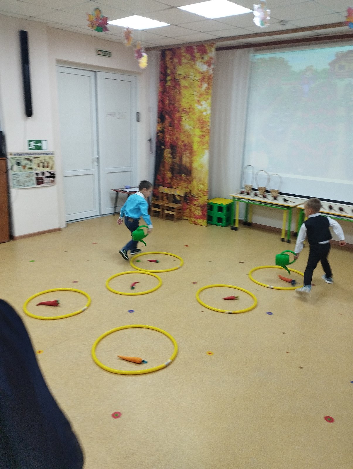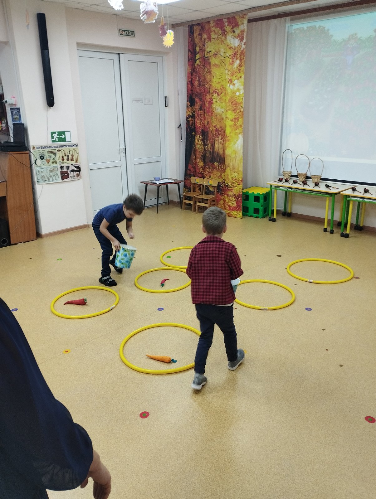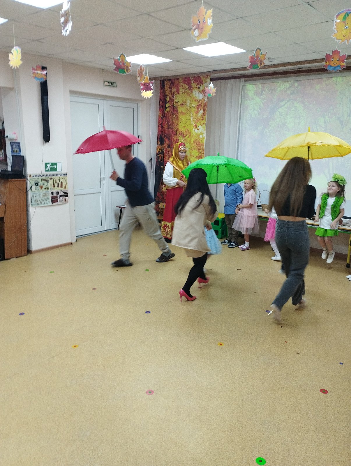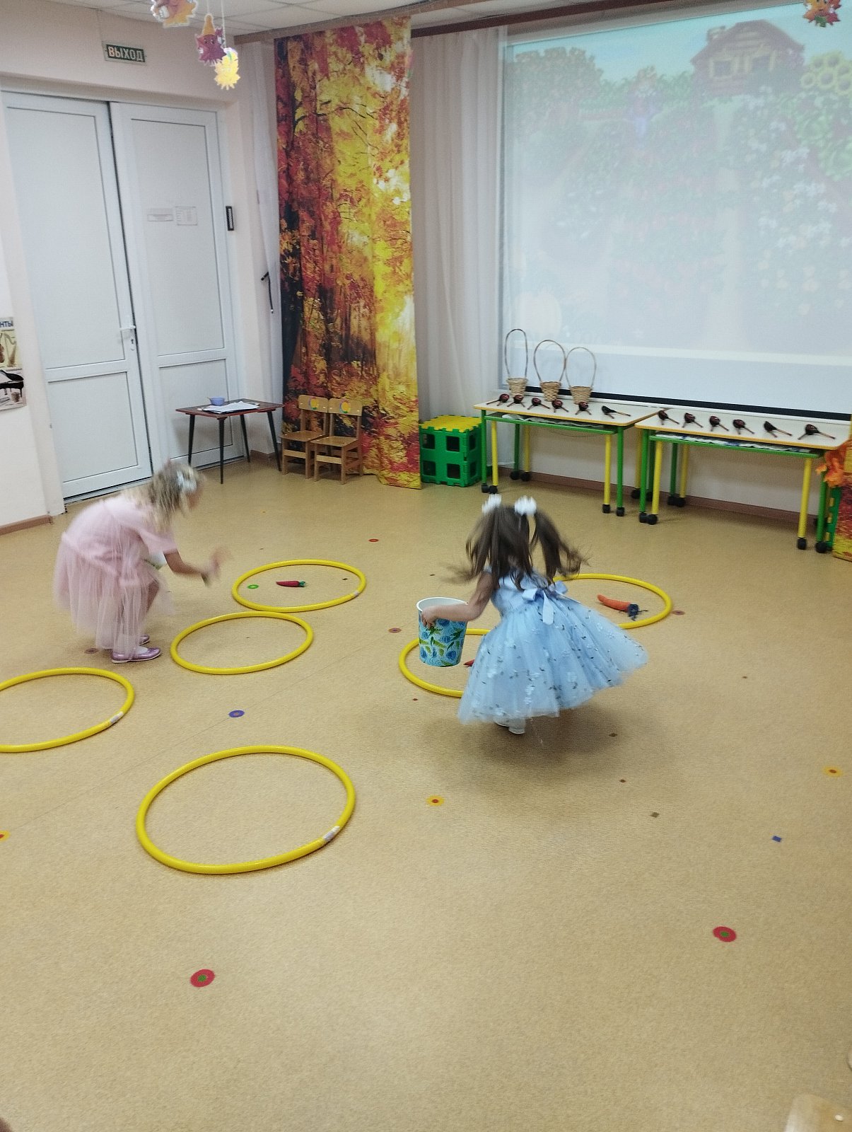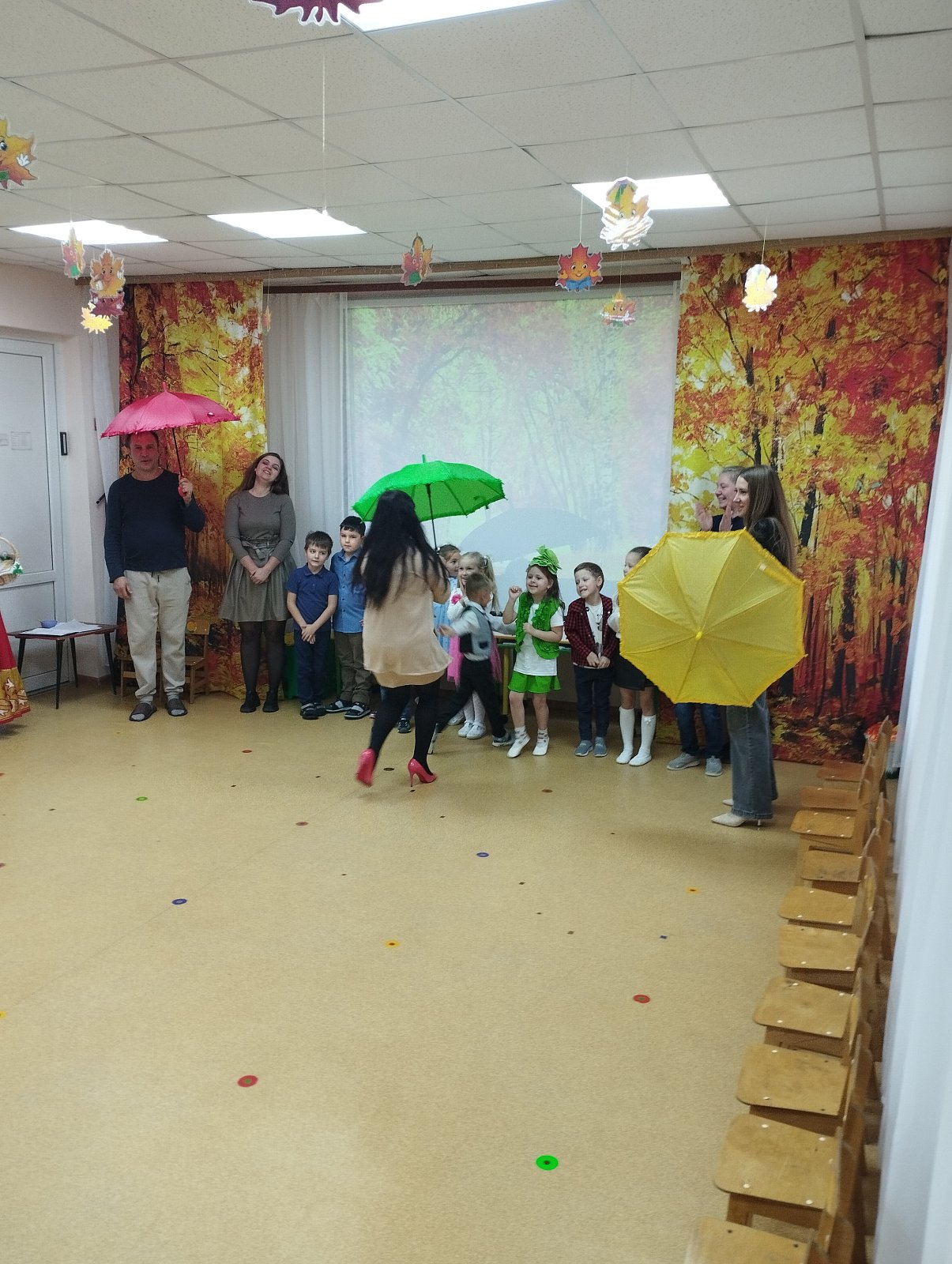 Красиво украшенный зал и веселая музыка создавали праздничное настроение. Воспитанники группы водили хоровод, пели песни, танцевали и принимали активное участие в подвижных играх. Праздник прошел весело и эмоционально. Все участники получили массу удовольствий и впечатлений. В завершение праздников дошколят ждал подарок от Осени — корзина с фруктами.