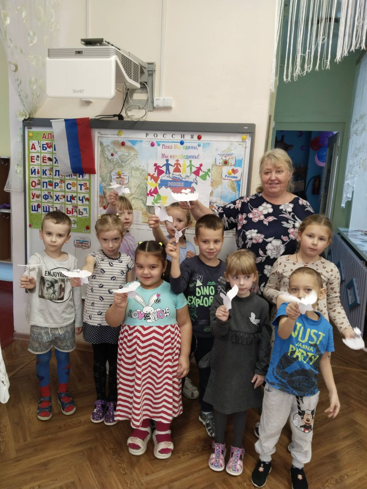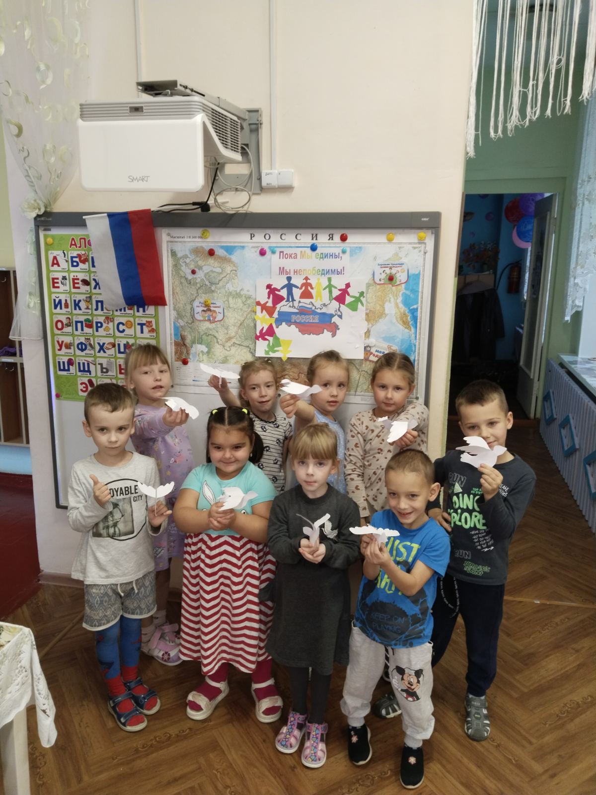 Воспитанники группы " Колокольчик" узнали о том, как велика, красива и богата ресурсами наша страна. закрепили знания о государственных символах. Выяснили, что сила России в том, что люди разных национальностей живут в стране дружно, и все они одинаково любят свою Родину - Россию.