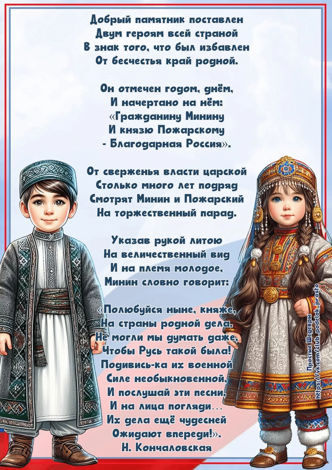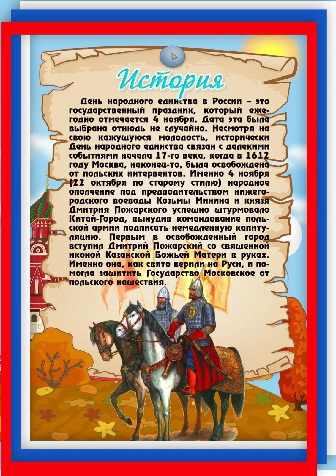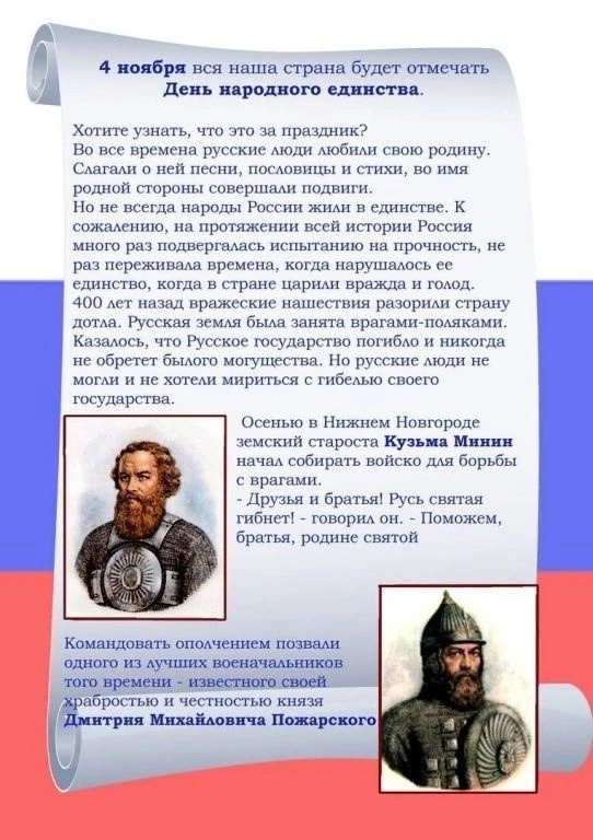 У праздника «День народного единства» очень древняя история. Всё началось в 1598 году. Тогда на Руси началось страшное время, которое называлось Смутой. Затяжной период борьбы за власть между сильными боярскими родами. Были войны и тяжелейшие засухи, не соблюдались законы. Этим и воспользовались поляки. Они напали на нашу страну и захватили Москву. Трудно было жителям Москвы, захватчики разрушили их дома, осквернили храмы. Людям надоело это терпеть, и нашлись такие лидеры, как староста Кузьма Минин и князь Дмитрий Пожарский. Они созвали народ и смогли освободить Москву от польских захватчиков.