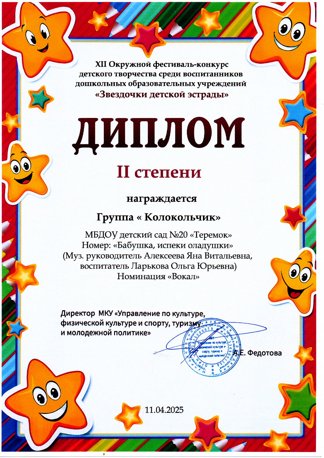 Воспитанники группы "Колокольчик" под руководством музыкального руководителя Алексеевой Яны Витальевны заняли призовое II место в номинации "Вокал".