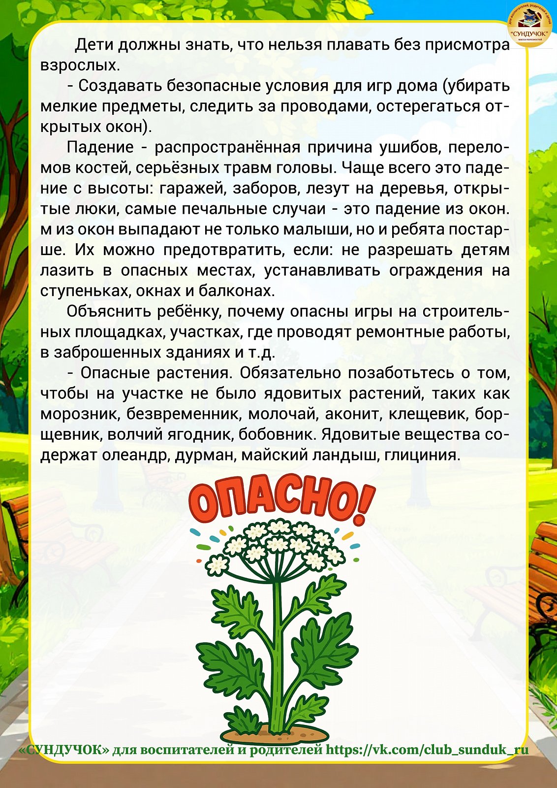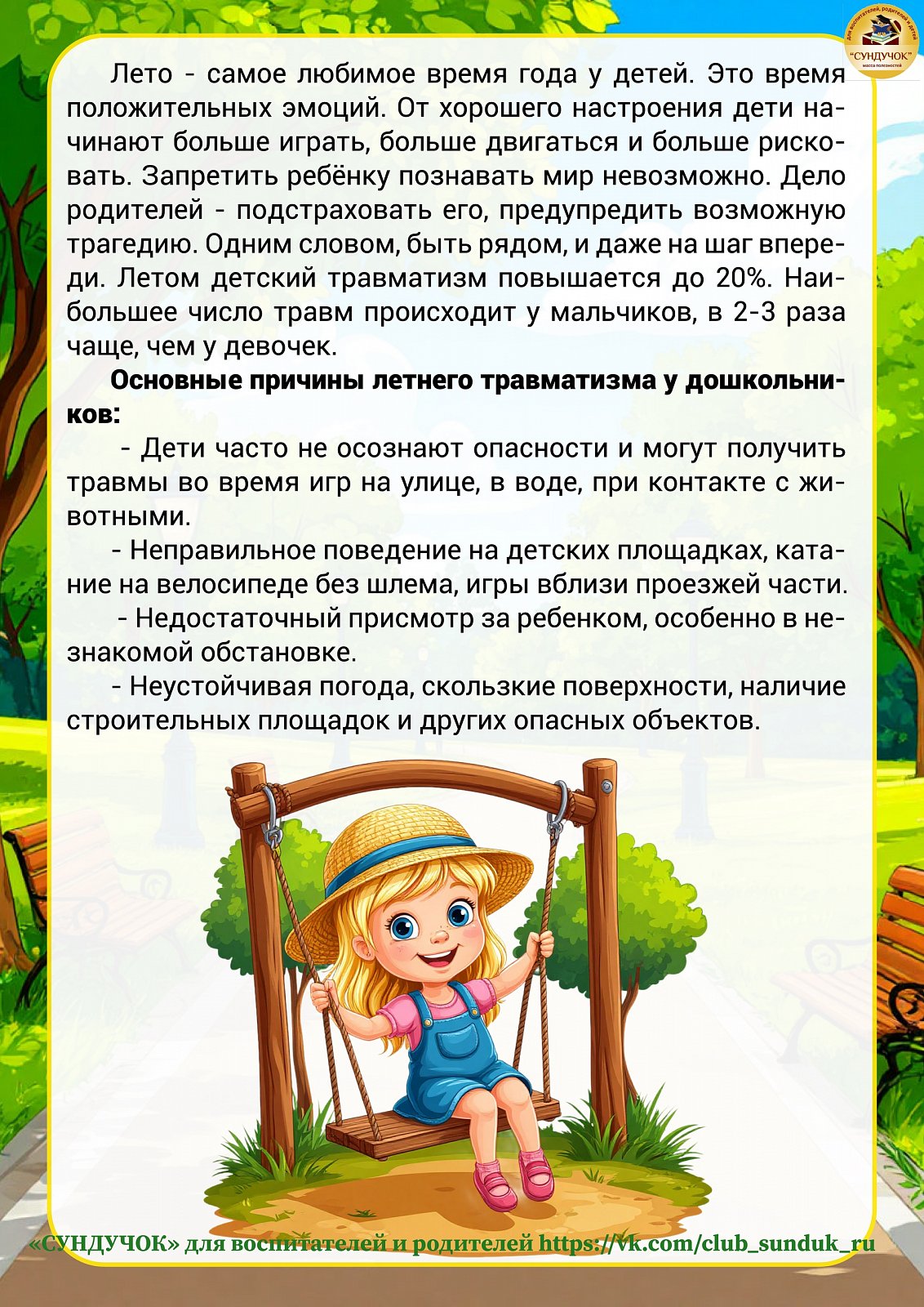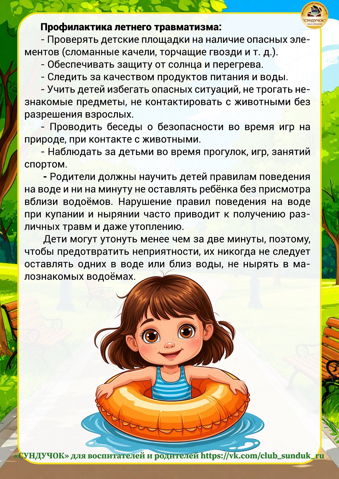 Предупреждение детского травматизма – одна из самых актуальных проблем нашего времени. За жизнь и здоровье детей отвечают взрослые, и в первую очередь именно родители должны создать безопасные условия жизнедеятельности детей в летний период. Главное, что должны помнить родители – ни при каких обстоятельствах не оставлять ребёнка без присмотра. Необходимо выделить некоторые правила поведения, которые дети должны выполнять неукоснительно, так как от этого зависят их здоровье и безопасность.