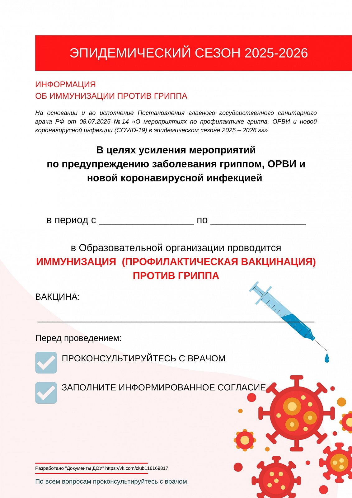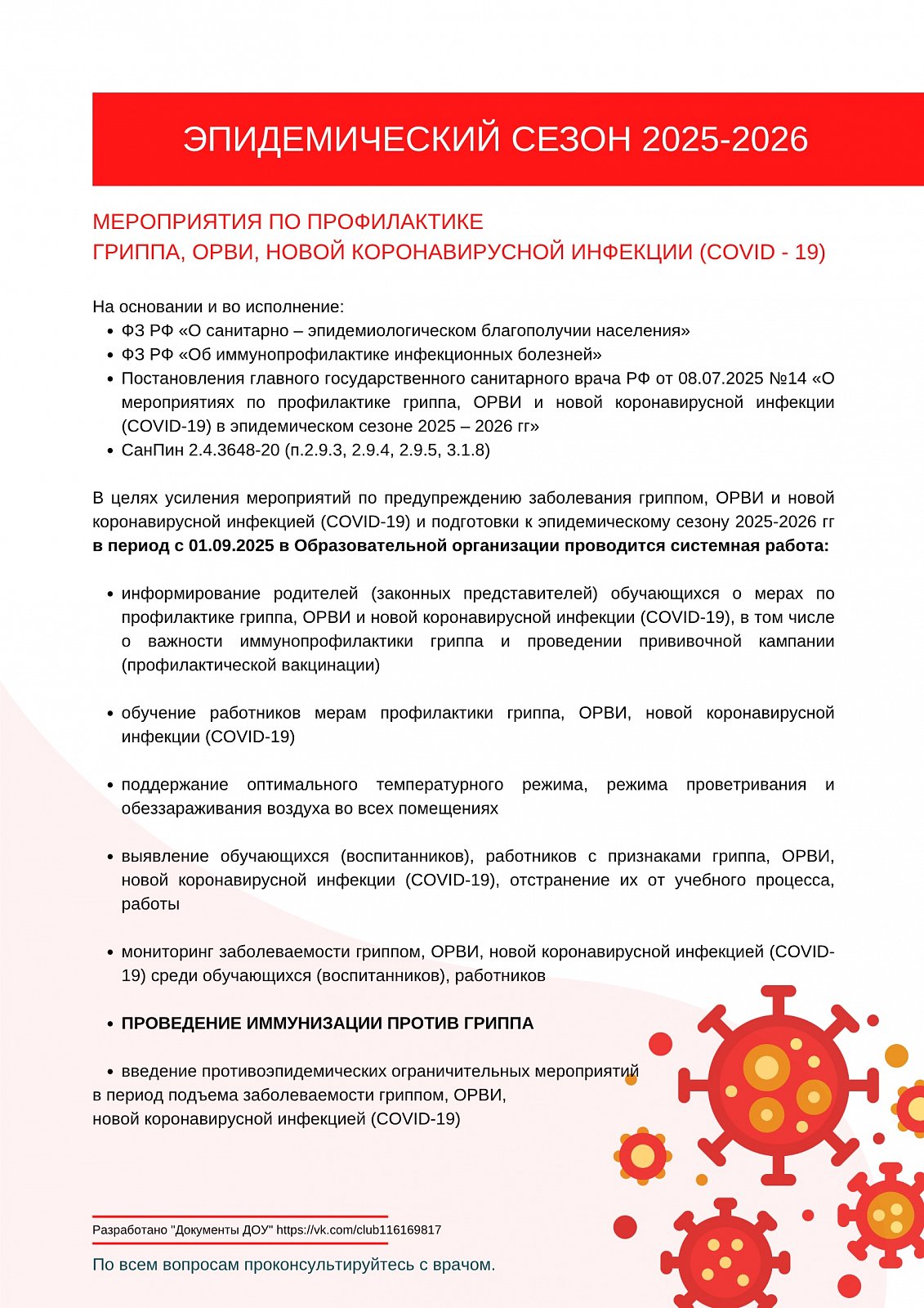 Новое постановление гл.гос.сан.врача РФ от 08.07.2025 №14 "О мероприятиях по профилактике гриппа, ОРВИ, новой коронавирусной инфекции в эпидемическом сезоне 2025-2026"