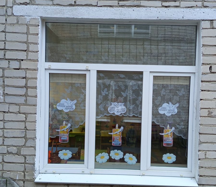 Воспитанники первой младшей группы «Солнышко» украсили окно памятными свечами и журавлями.