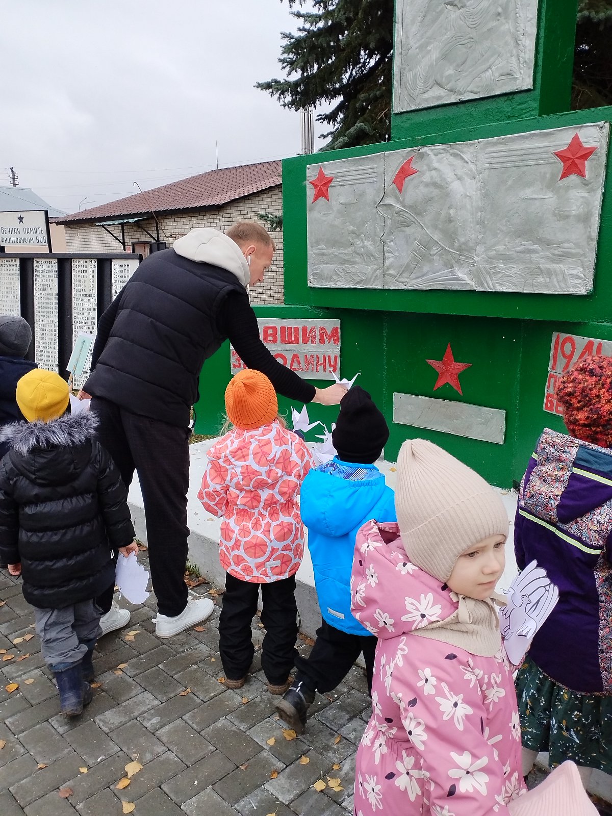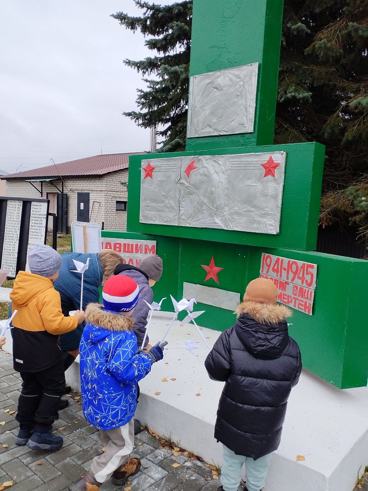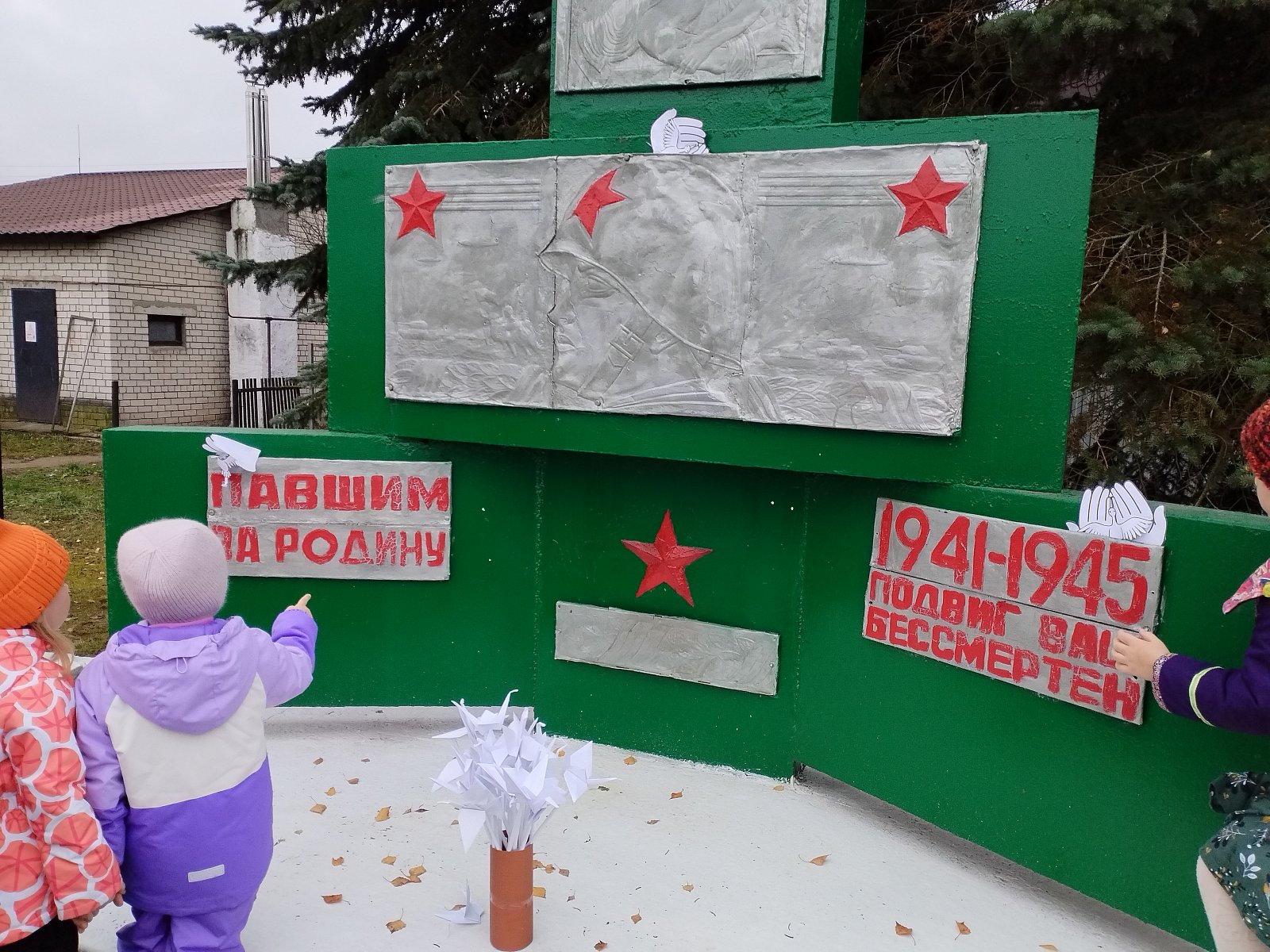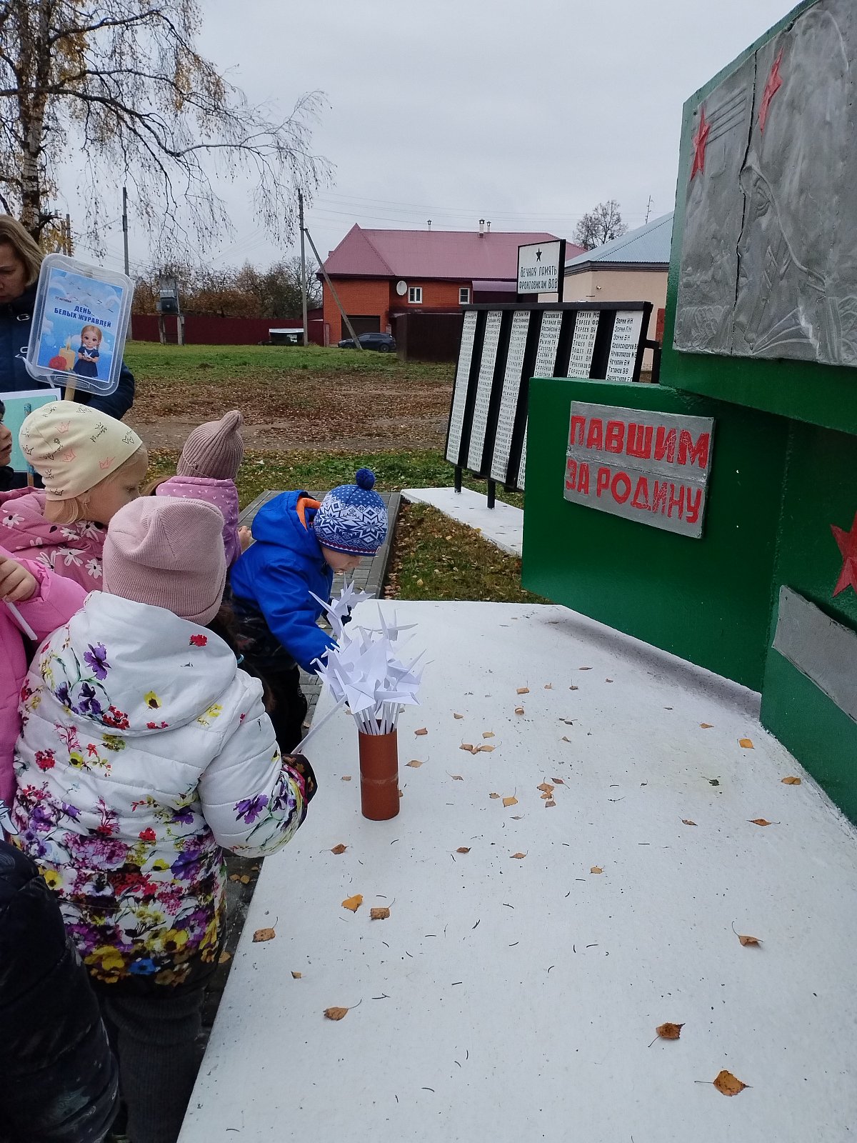 Воспитанники старшей группы и группы компенсирующей направленности вышли на улицу села с буклетами и раздали их прохожим. Также воспитанники совместно с родителями возложили белых журавлей и открытки к Мемориалу павшим воинам в Великой Отечественной войне.