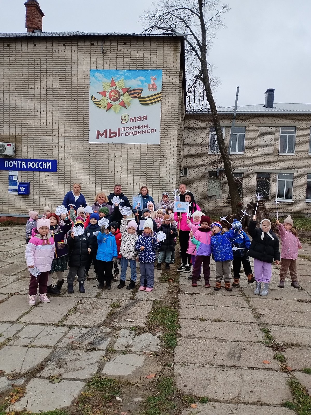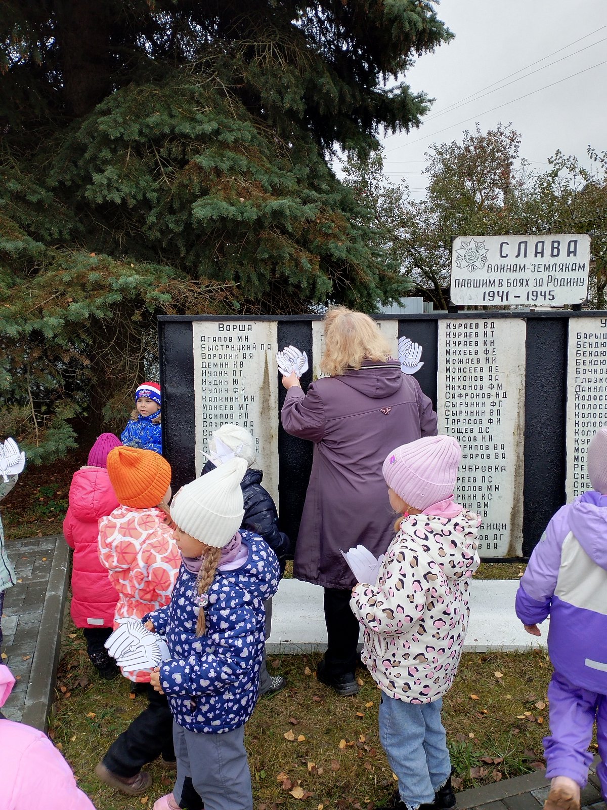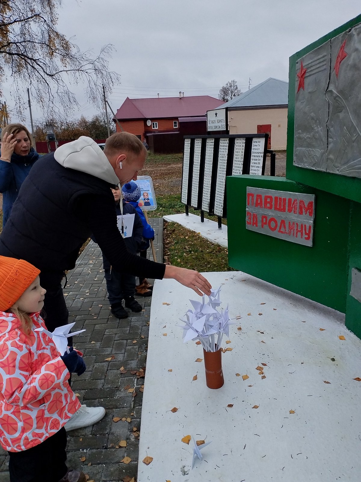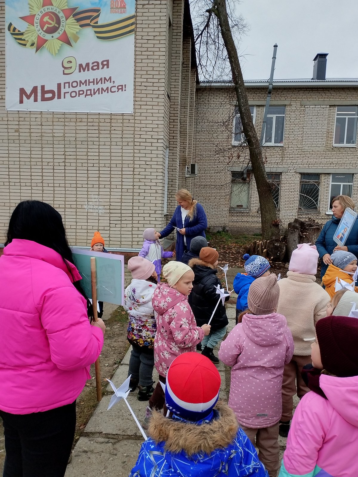 Воспитанники старшей группы и группы компенсирующей направленности вышли на улицу села с буклетами и раздали их прохожим. Также воспитанники совместно с родителями возложили белых журавлей и открытки к Мемориалу павшим воинам в Великой Отечественной войне.