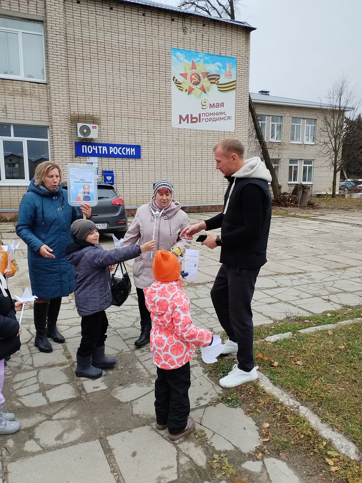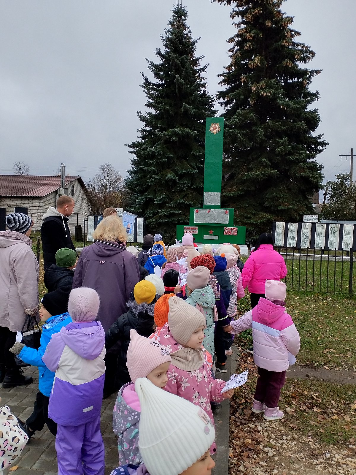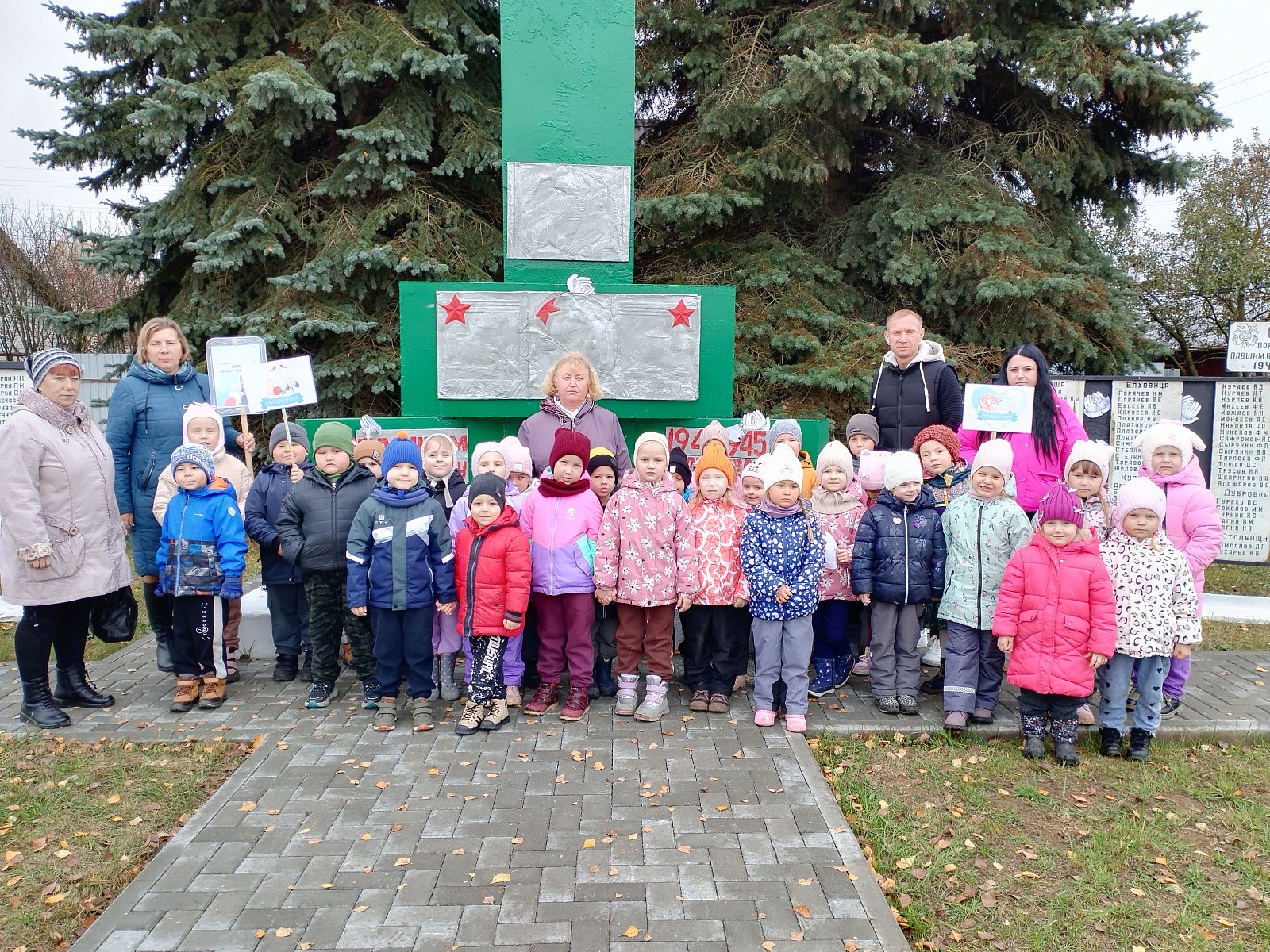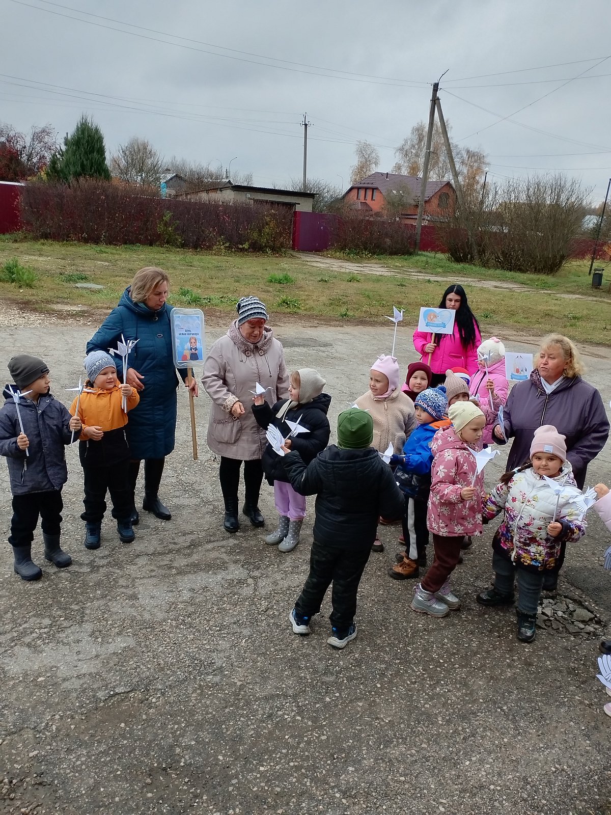Воспитанники старшей группы и группы компенсирующей направленности вышли на улицу села с буклетами и раздали их прохожим. Также воспитанники совместно с родителями возложили белых журавлей и открытки к Мемориалу павшим воинам в Великой Отечественной войне.