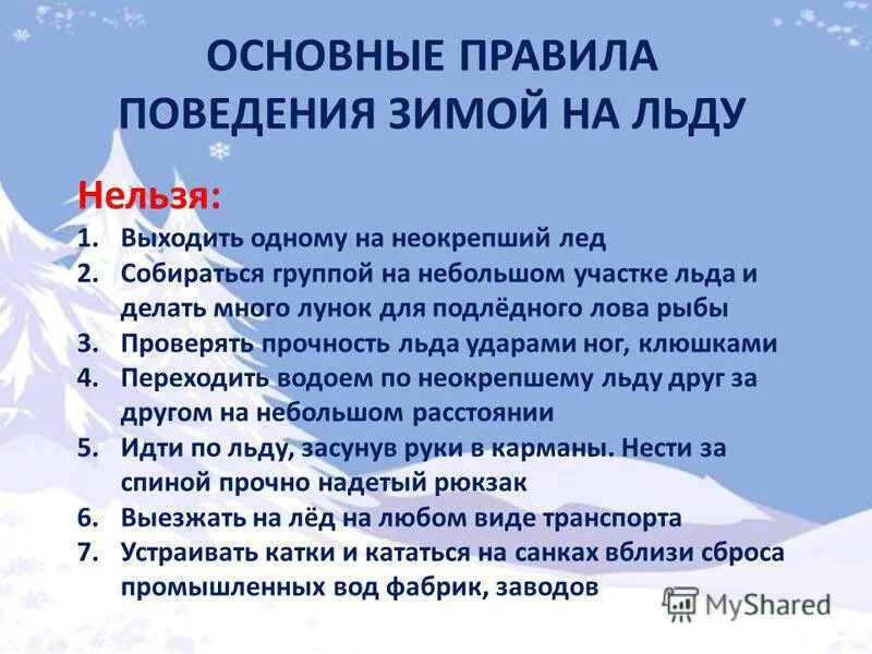 Не выходите на лёд в темное время суток, при плохой видимости или во время снегопада